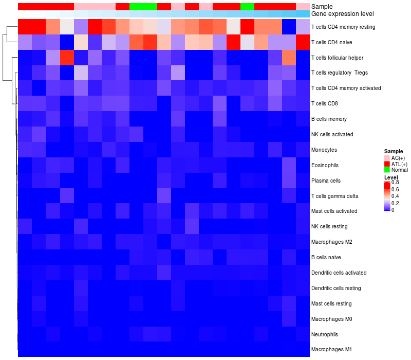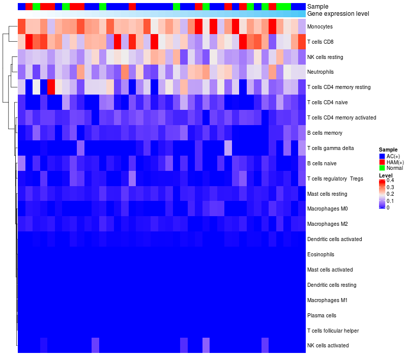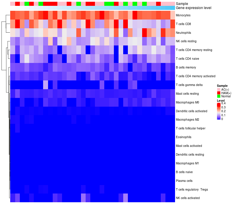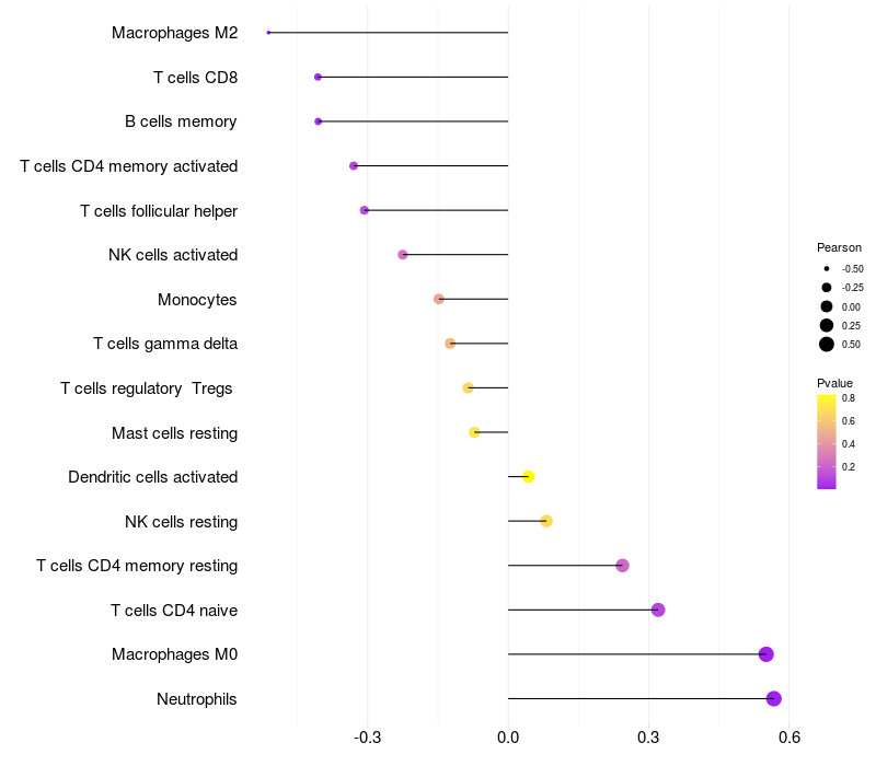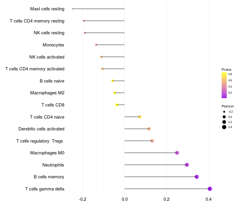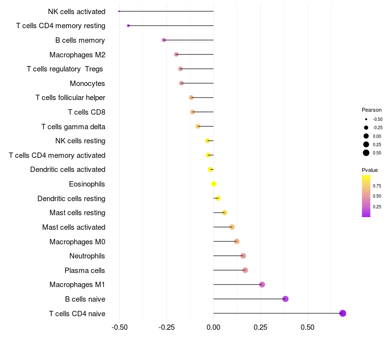 Lollipop of DBN1 expression and immune infiltrating cell level correlation result in HTLV1+ samples