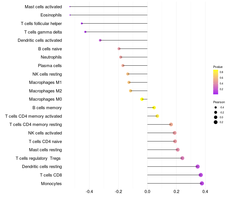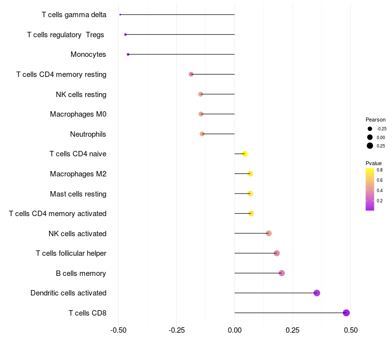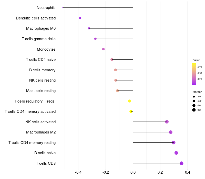 Lollipop of DBT expression and immune infiltrating cell level correlation result in HTLV1+ samples
