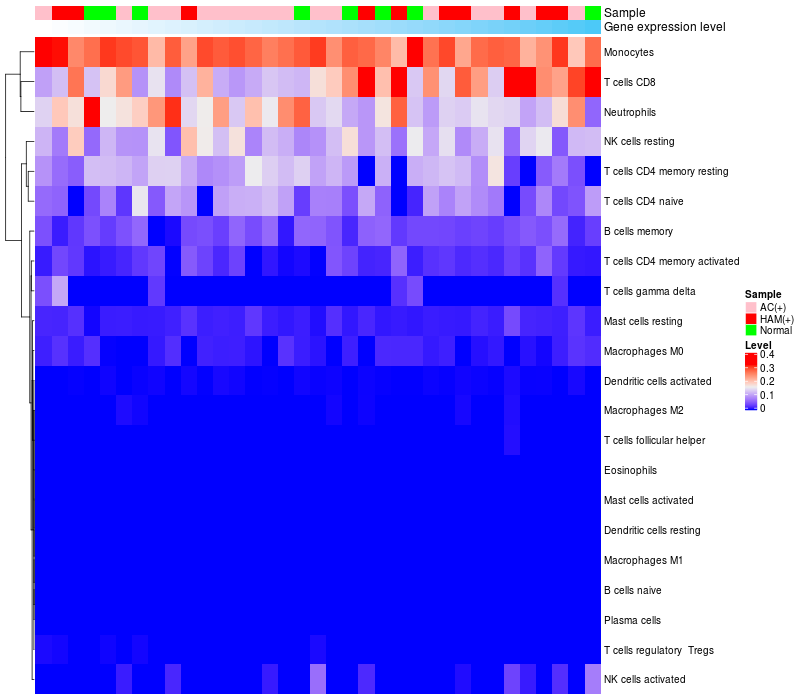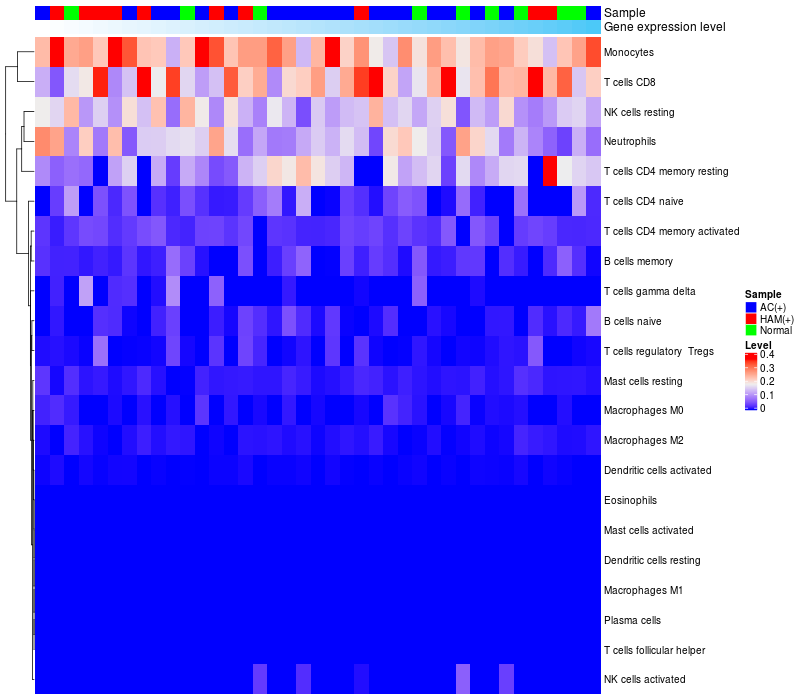 Normal (8), Asymptomatic carriers (HTLV1+)(17), HTLV-1-associated myelopathy (HTLV1+)(10) |