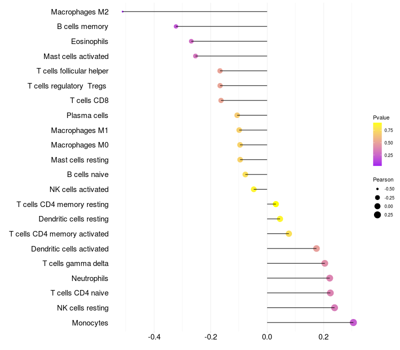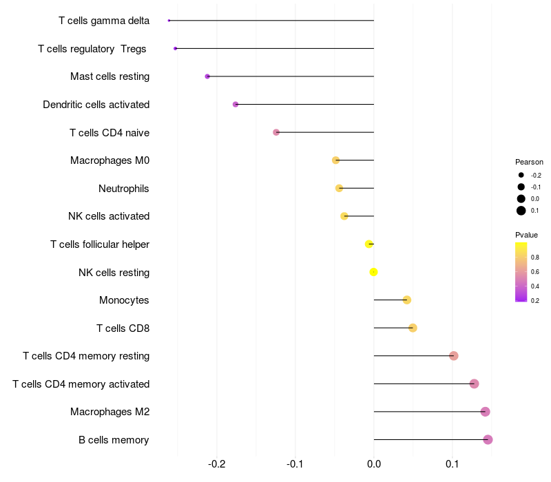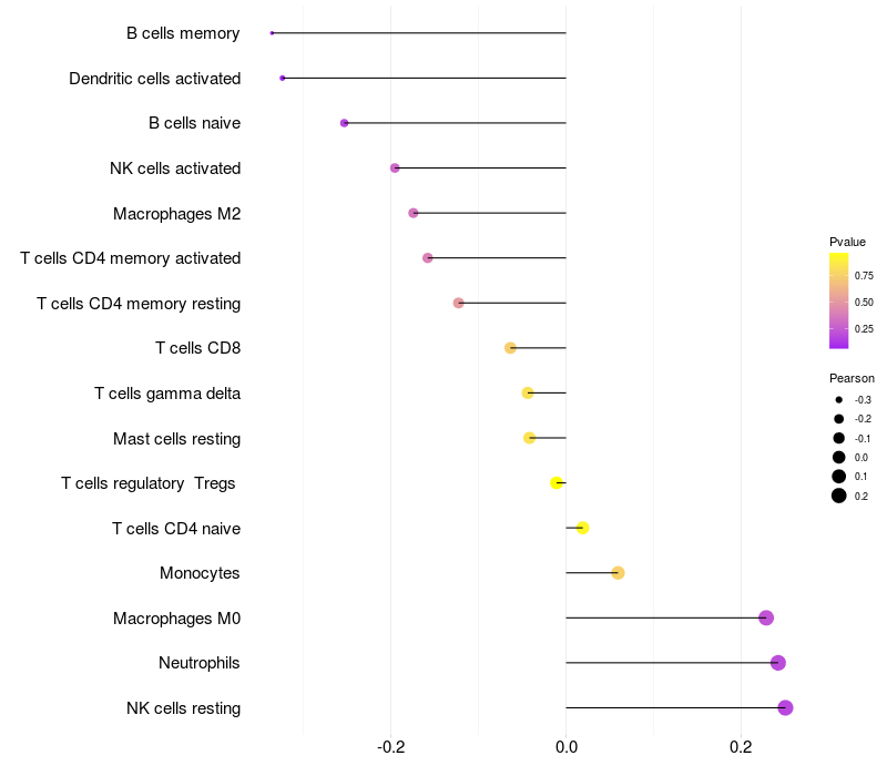 Lollipop of DCBLD1 expression and immune infiltrating cell level correlation result in HTLV1+ samples
