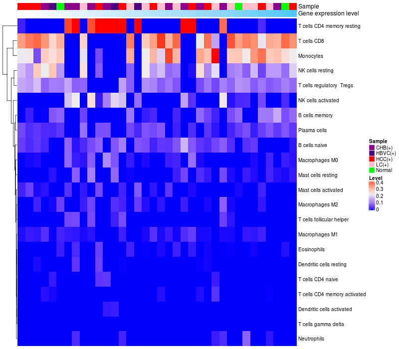 Chronic hepatitis B patients (HBV+)(10),Hepatocellular carcinoma (HBV+)(10),Liver cirrhosis(HBV+)(10),Normal(3),HBV carriers (3) |
