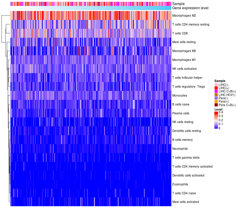 Liver hepatocellular carcinoma HCV (HBV+)(86), Liver hepatocellular carcinoma HCV (HBV-)(19), Liver hepatocellular carcinoma (HBV+)(209), Liver hepatocellular carcinoma (HBV+)(60), Paracancerous HCV (HBV+)(4), Paracancerous (HBV-)(28), Paracancerous (HBV+)(18) |