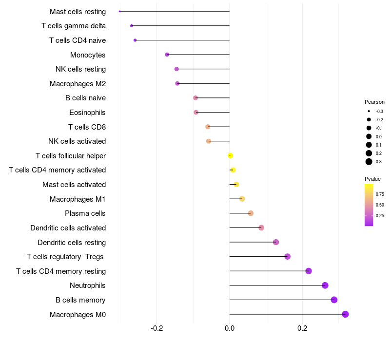 Lollipop of DDX17 expression and immune infiltrating cell level correlation result in HBV+ Liver cirrhosis samples