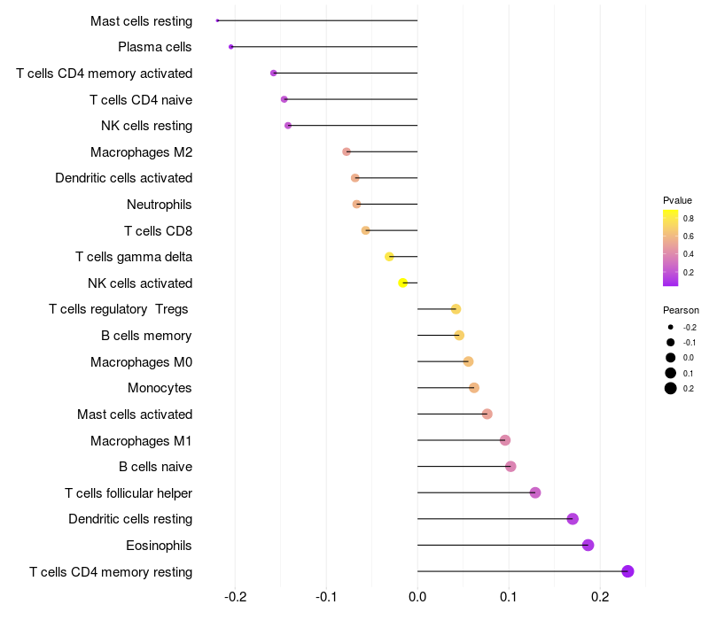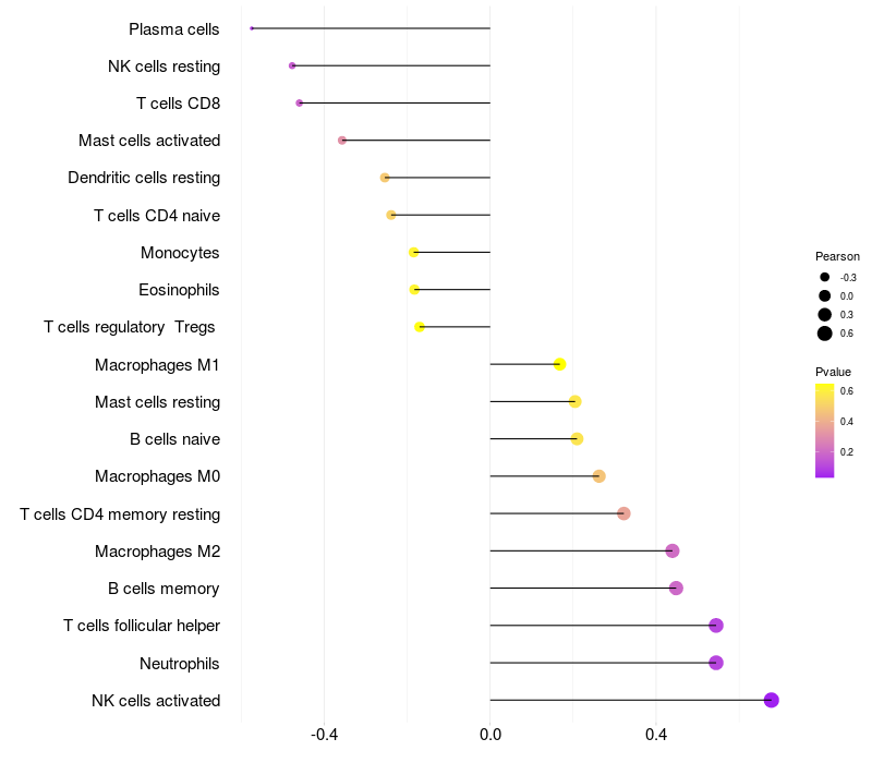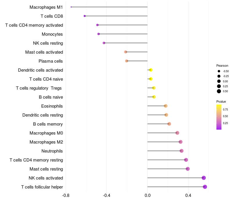 Lollipop of DDX18 expression and immune infiltrating cell level correlation result in HBV+ Liver cirrhosis samples