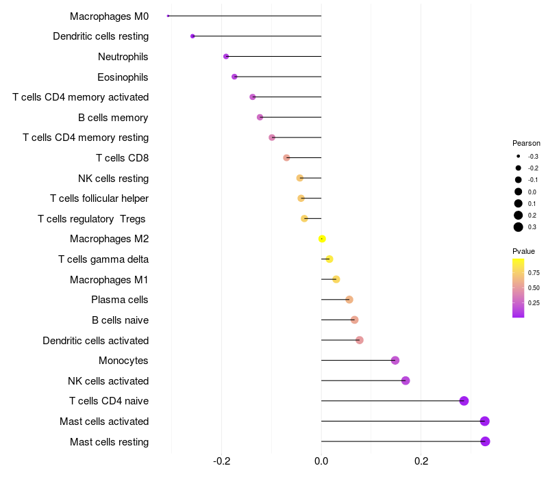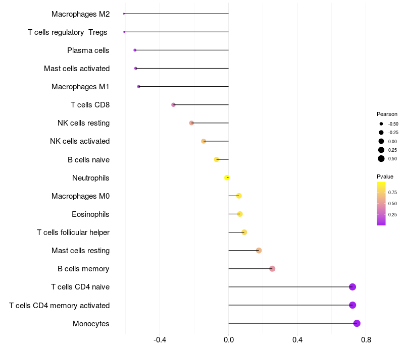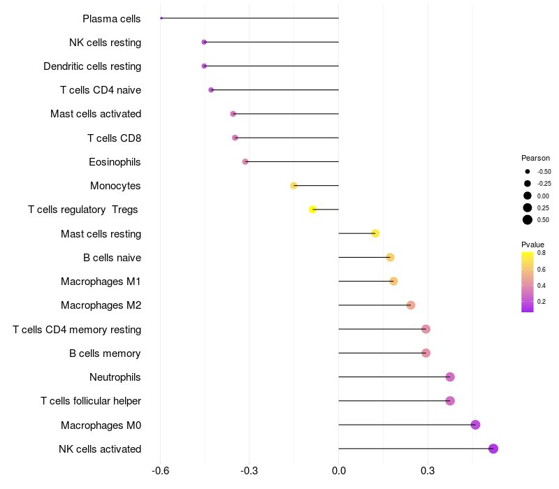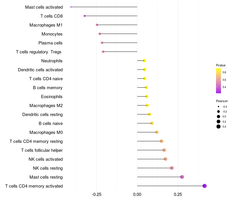 Lollipop of DDX24 expression and immune infiltrating cell level correlation result in HBV+ Liver cirrhosis samples