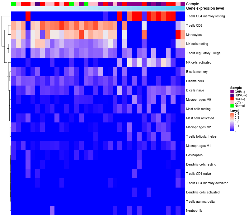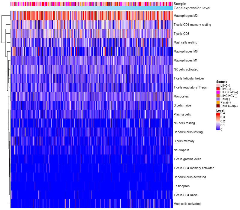 Liver hepatocellular carcinoma HCV (HBV+)(86), Liver hepatocellular carcinoma HCV (HBV-)(19), Liver hepatocellular carcinoma (HBV+)(209), Liver hepatocellular carcinoma (HBV+)(60), Paracancerous HCV (HBV+)(4), Paracancerous (HBV-)(28), Paracancerous (HBV+)(18) |