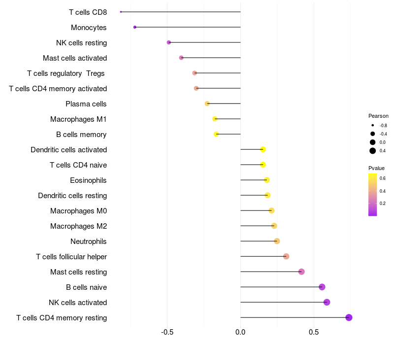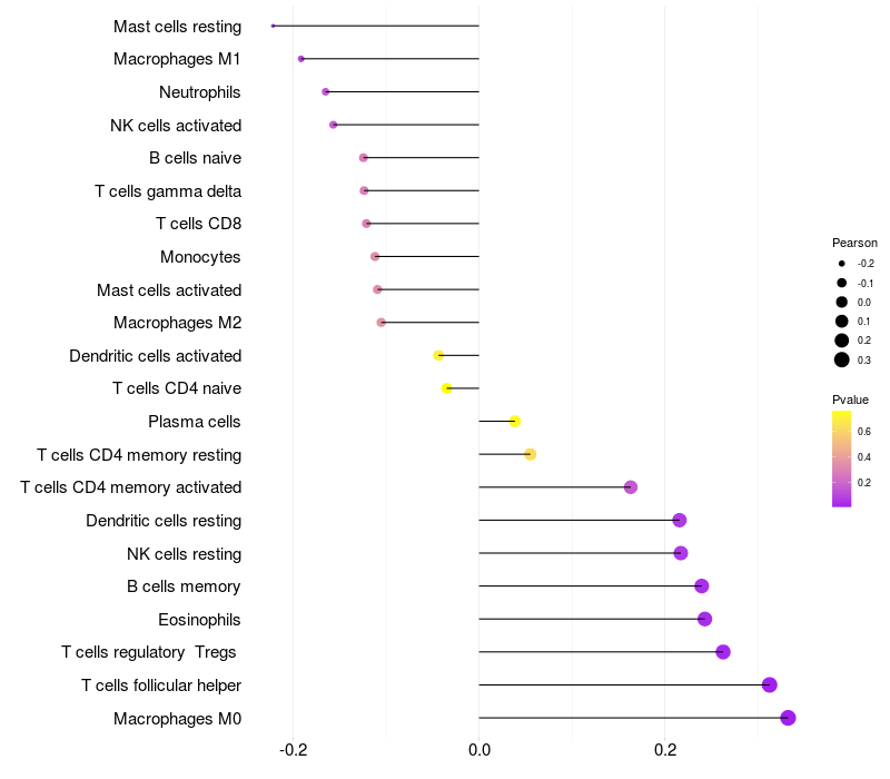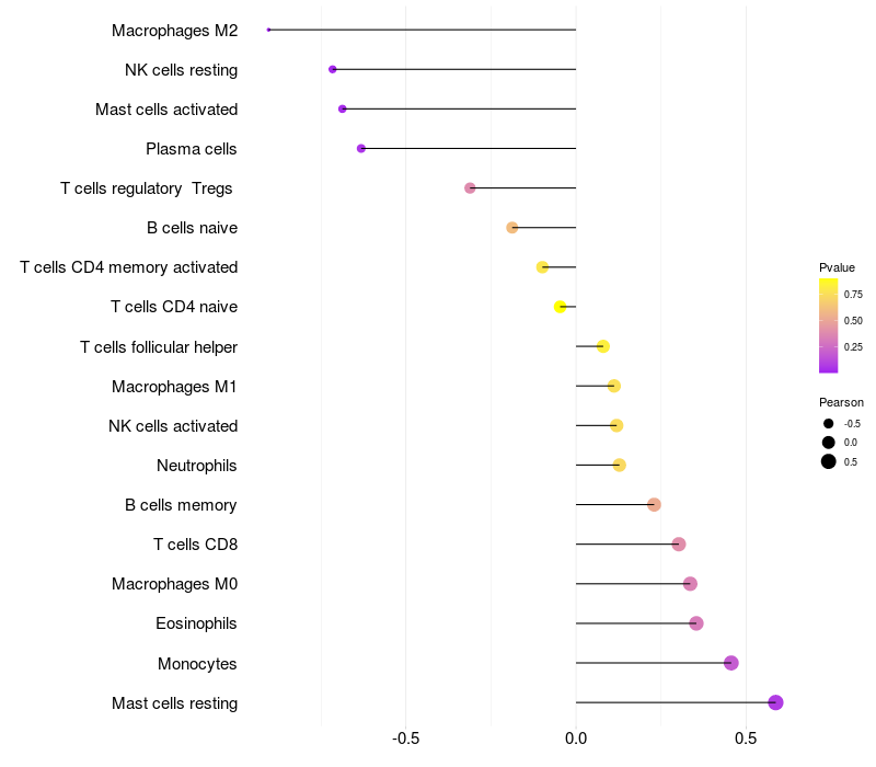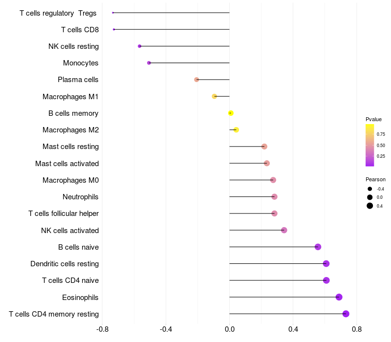 Lollipop of DDX27 expression and immune infiltrating cell level correlation result in HBV+ Liver cirrhosis samples