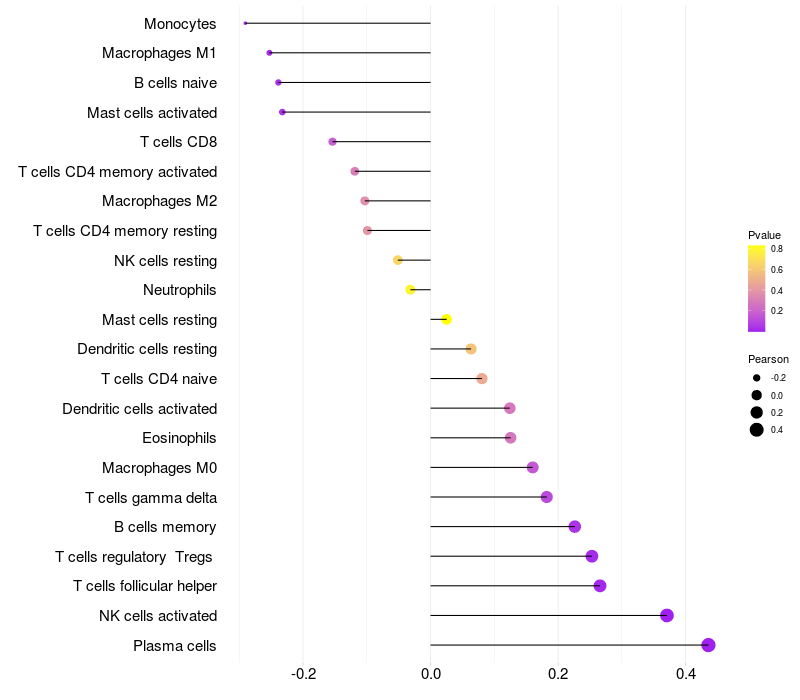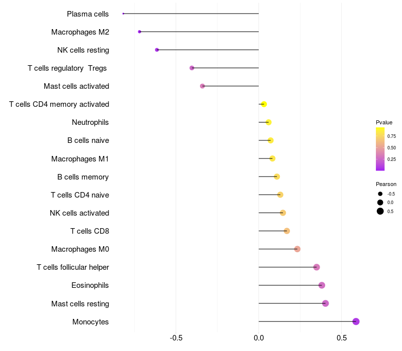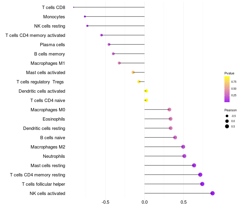 Lollipop of DEAF1 expression and immune infiltrating cell level correlation result in HBV+ Liver cirrhosis samples