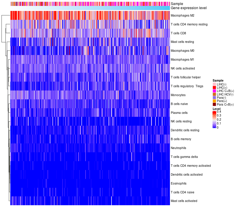 Liver hepatocellular carcinoma HCV (HBV+)(86), Liver hepatocellular carcinoma HCV (HBV-)(19), Liver hepatocellular carcinoma (HBV+)(209), Liver hepatocellular carcinoma (HBV+)(60), Paracancerous HCV (HBV+)(4), Paracancerous (HBV-)(28), Paracancerous (HBV+)(18) |