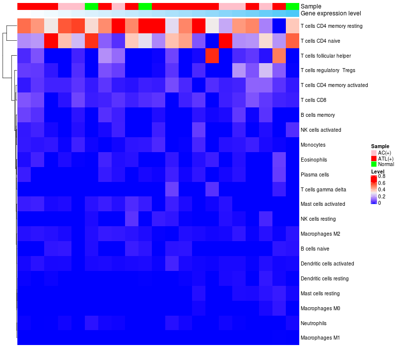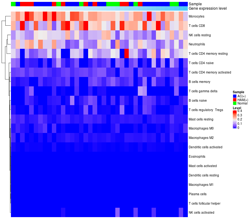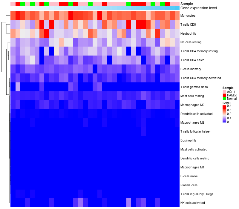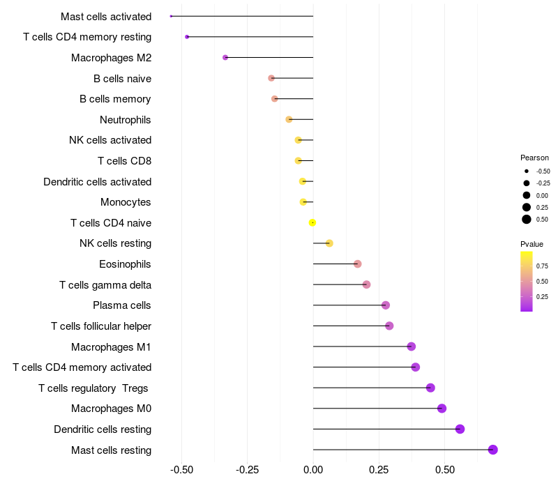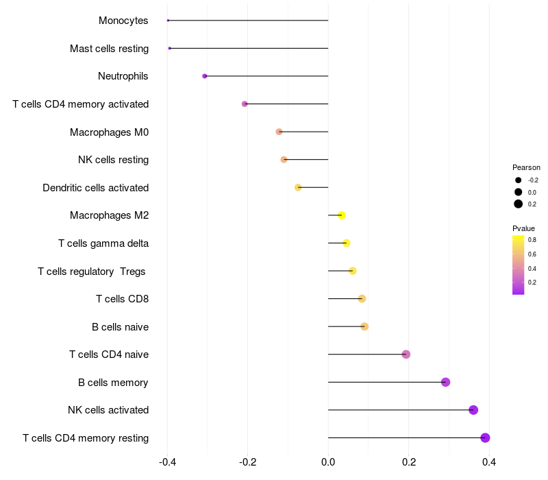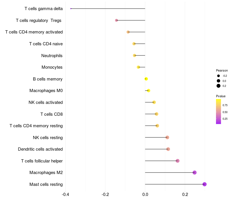 Lollipop of DEFB119 expression and immune infiltrating cell level correlation result in HTLV1+ samples