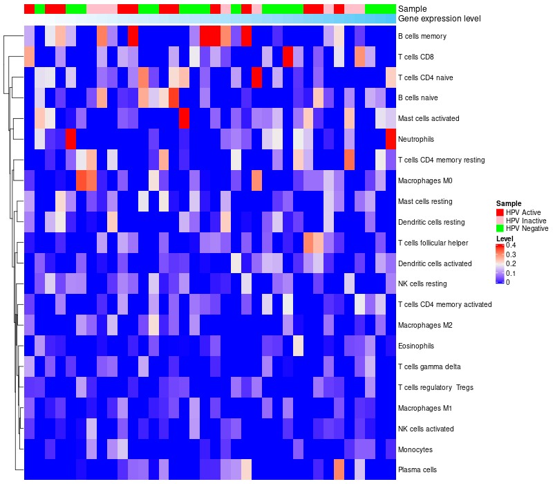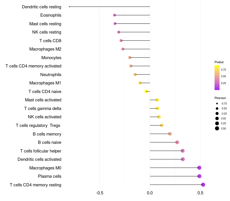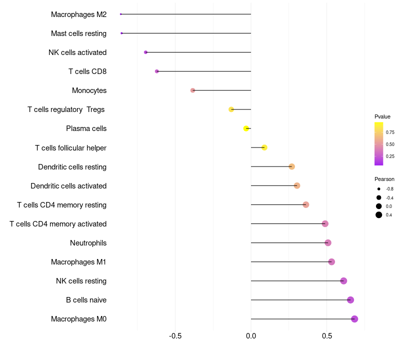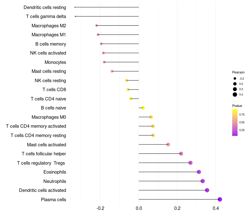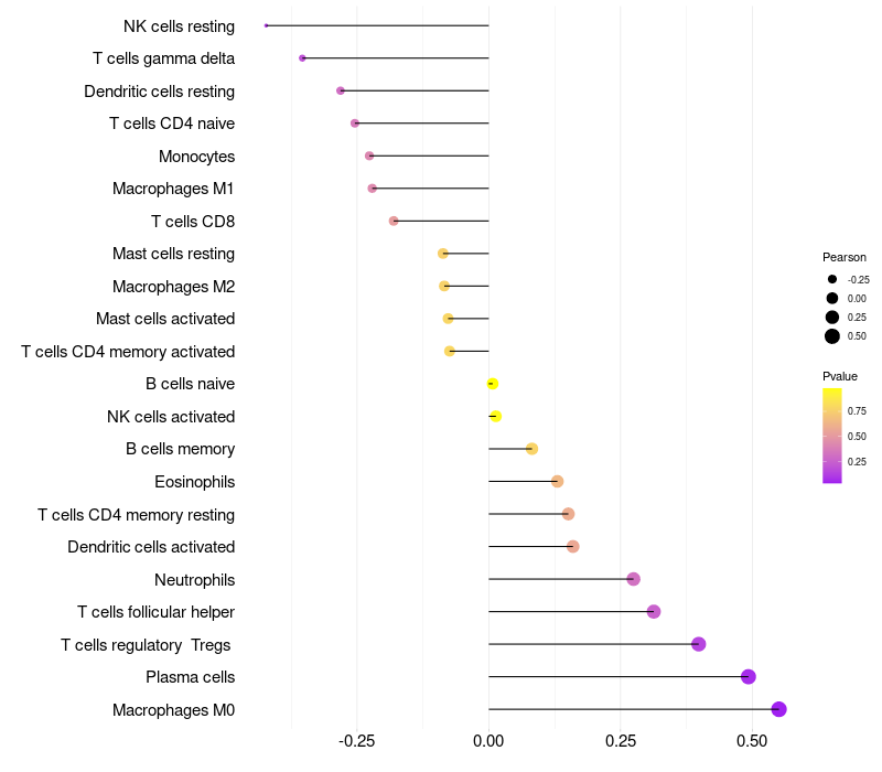 Lollipop of DEFB136 expression and immune infiltrating cell level correlation result in HPV+ samples