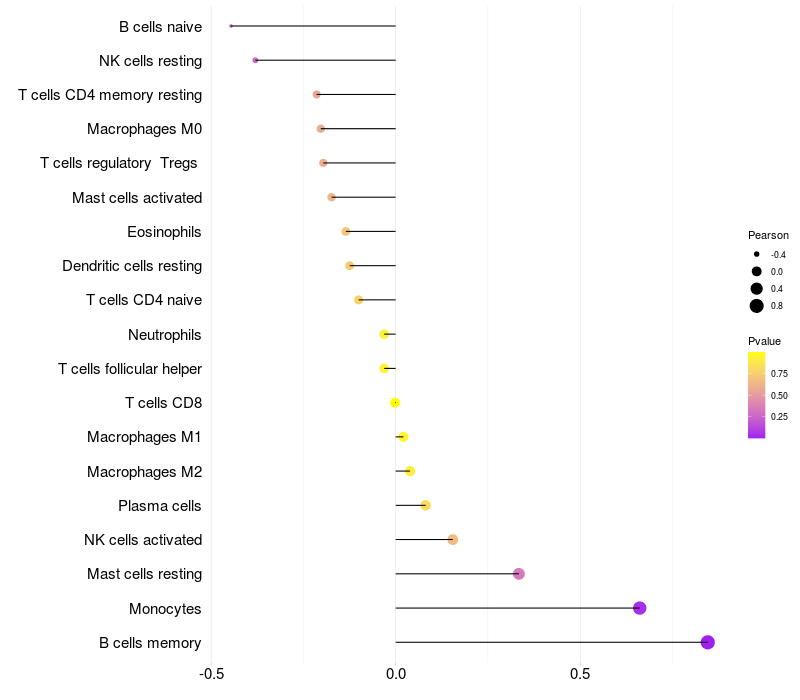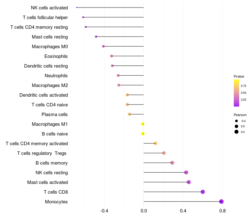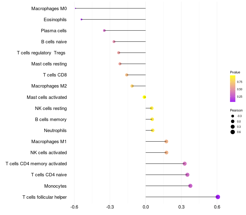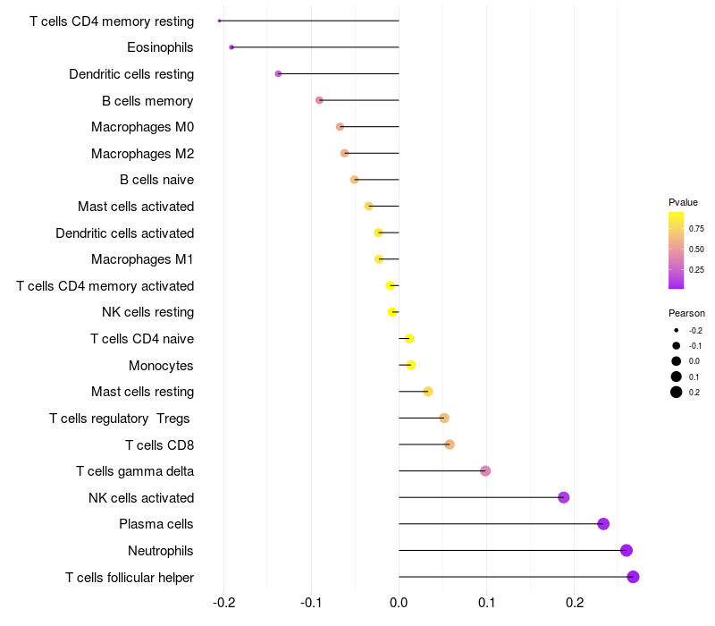 Lollipop of DENND1A expression and immune infiltrating cell level correlation result in HBV+ Liver cirrhosis samples