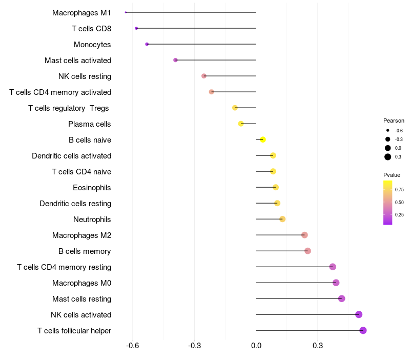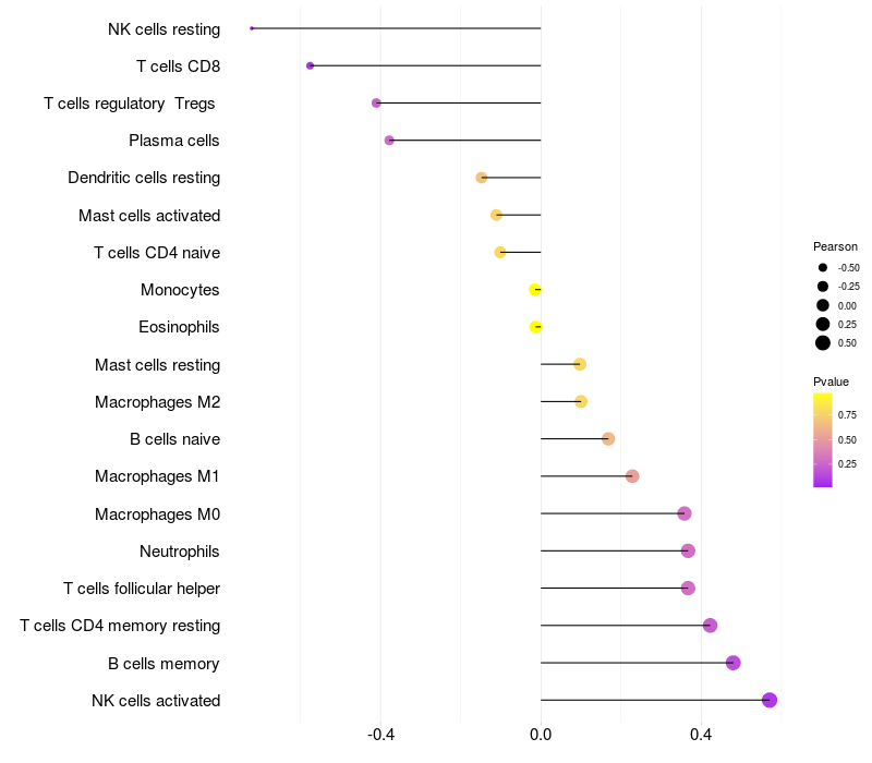 Lollipop of DENND4A expression and immune infiltrating cell level correlation result in HBV+ Chronic HBV (CHB) infection samples