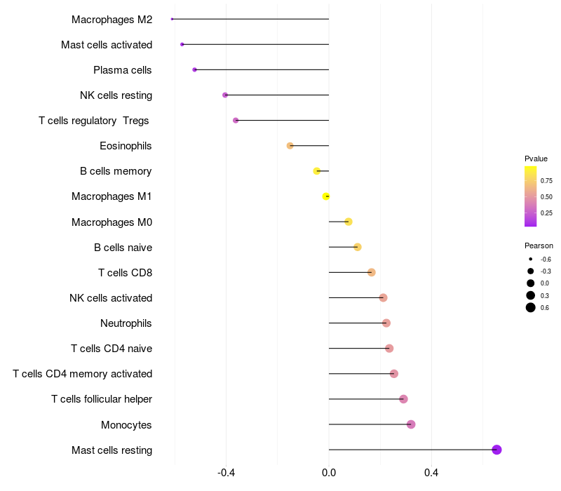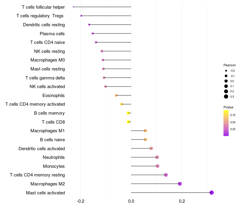 Lollipop of DENND4A expression and immune infiltrating cell level correlation result in HBV+ Liver cirrhosis samples