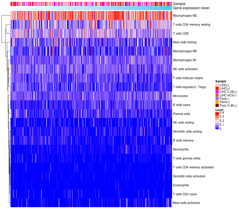Liver hepatocellular carcinoma HCV (HBV+)(86), Liver hepatocellular carcinoma HCV (HBV-)(19), Liver hepatocellular carcinoma (HBV+)(209), Liver hepatocellular carcinoma (HBV+)(60), Paracancerous HCV (HBV+)(4), Paracancerous (HBV-)(28), Paracancerous (HBV+)(18) |