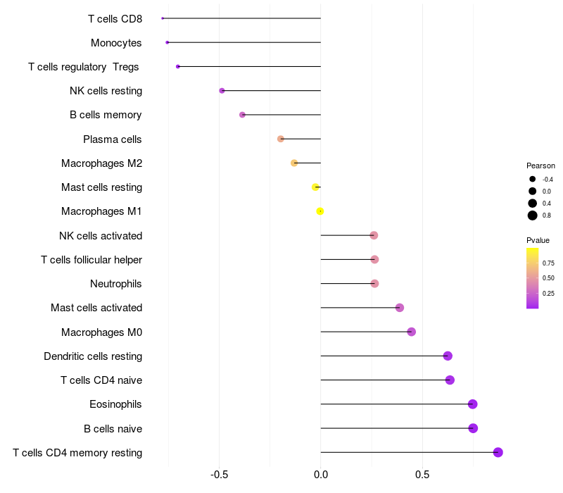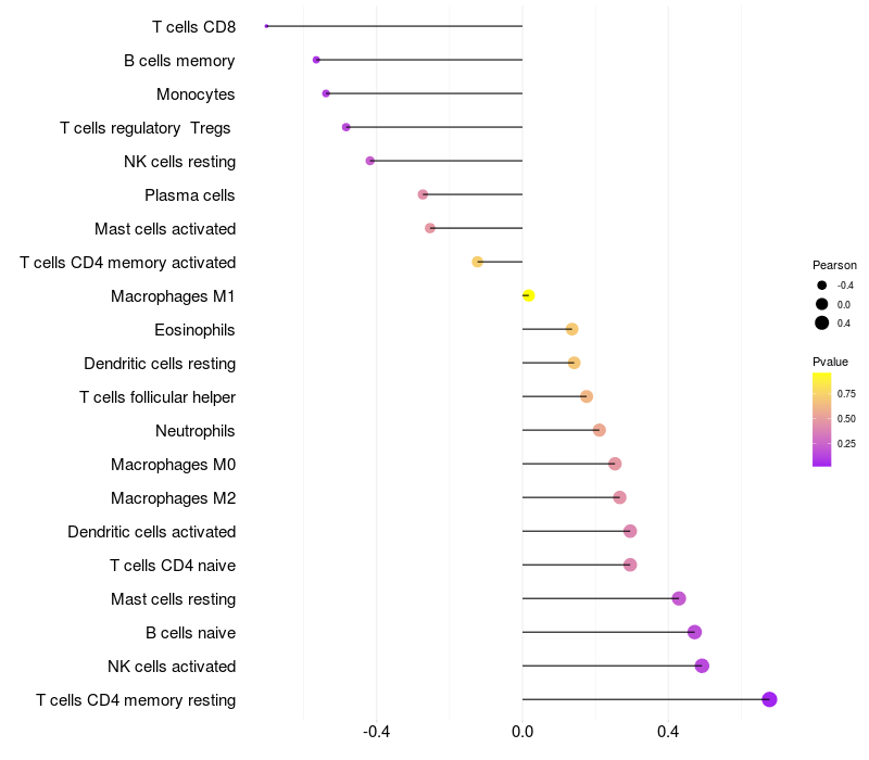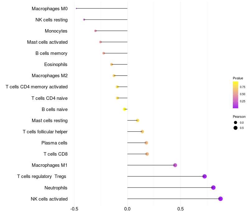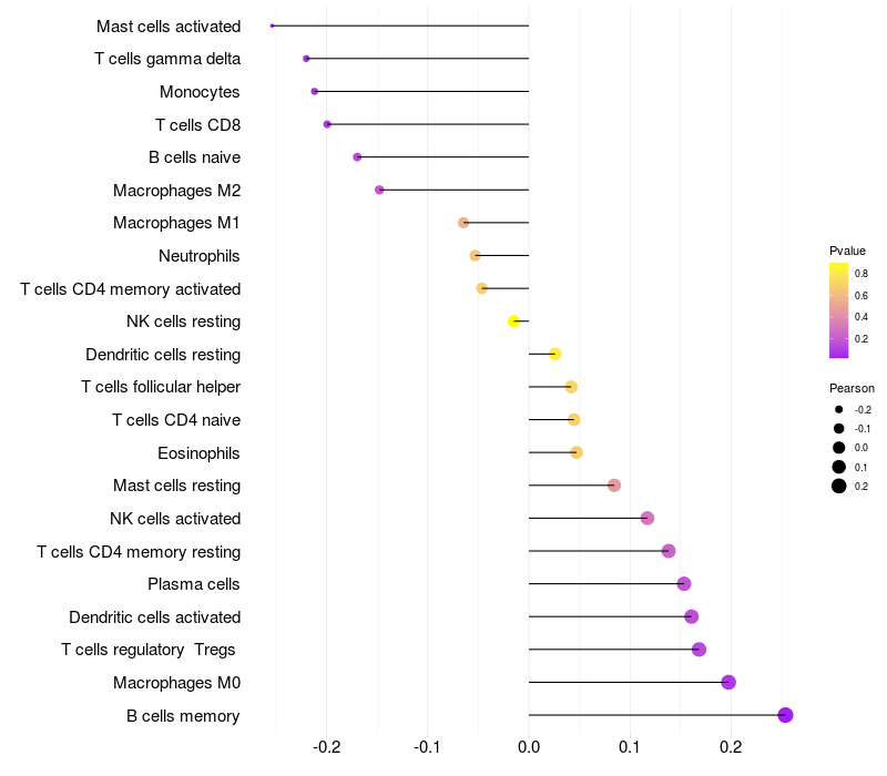 Lollipop of DGCR2 expression and immune infiltrating cell level correlation result in HBV+ Liver cirrhosis samples