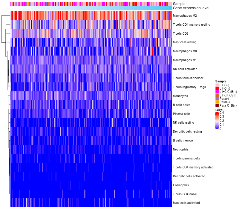 Liver hepatocellular carcinoma HCV (HBV+)(86), Liver hepatocellular carcinoma HCV (HBV-)(19), Liver hepatocellular carcinoma (HBV+)(209), Liver hepatocellular carcinoma (HBV+)(60), Paracancerous HCV (HBV+)(4), Paracancerous (HBV-)(28), Paracancerous (HBV+)(18) |