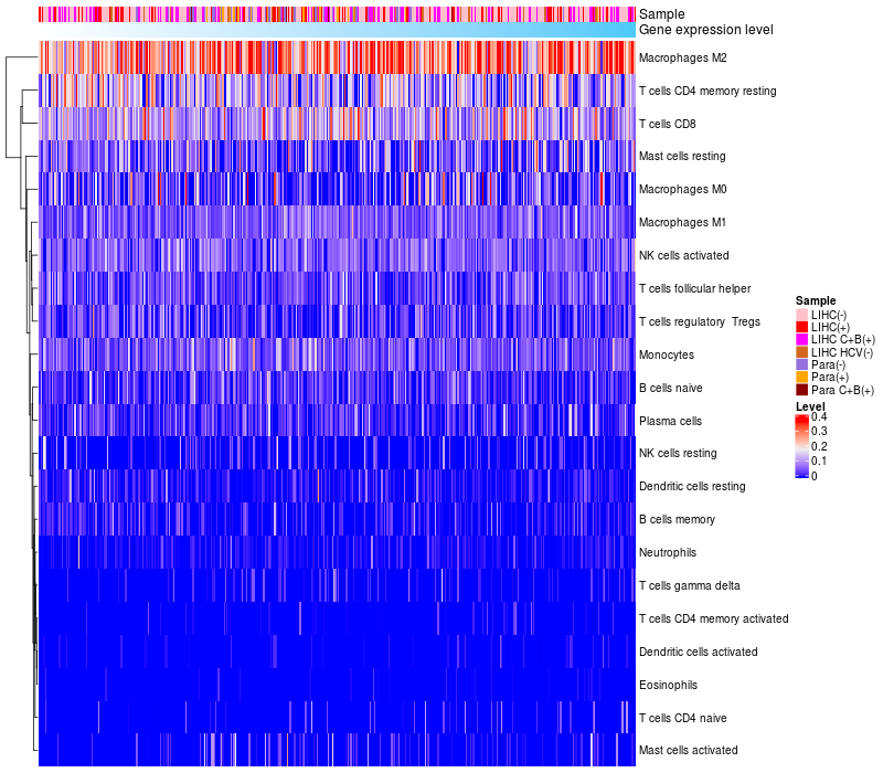 Liver hepatocellular carcinoma HCV (HBV+)(86), Liver hepatocellular carcinoma HCV (HBV-)(19), Liver hepatocellular carcinoma (HBV+)(209), Liver hepatocellular carcinoma (HBV+)(60), Paracancerous HCV (HBV+)(4), Paracancerous (HBV-)(28), Paracancerous (HBV+)(18) |
