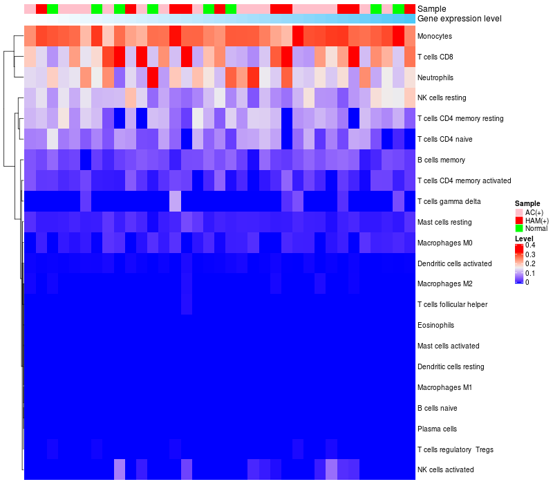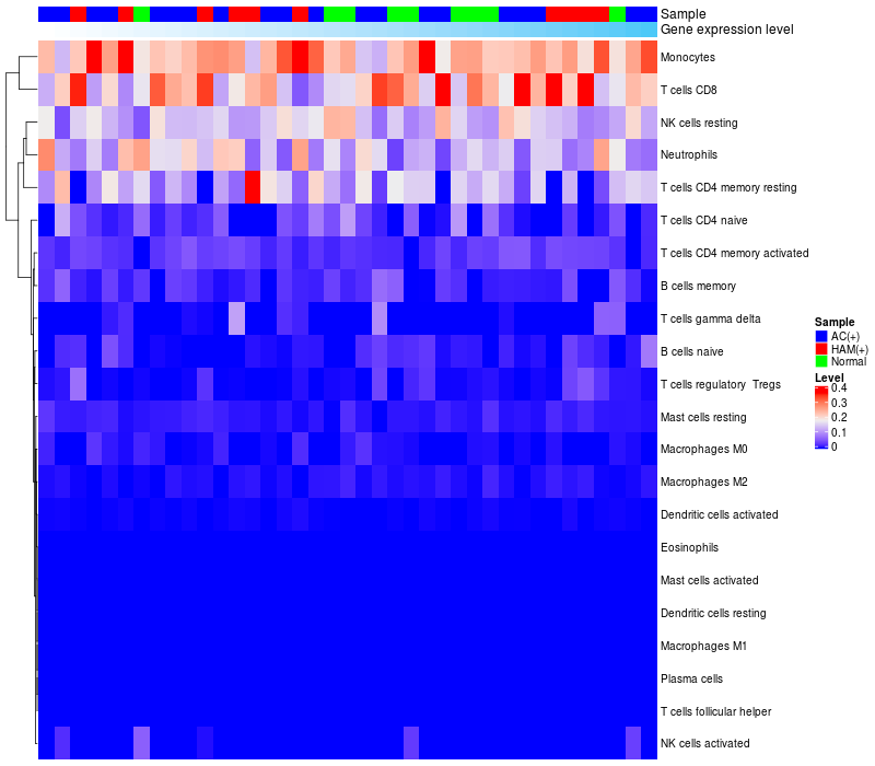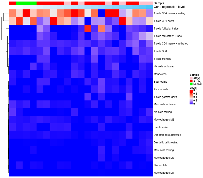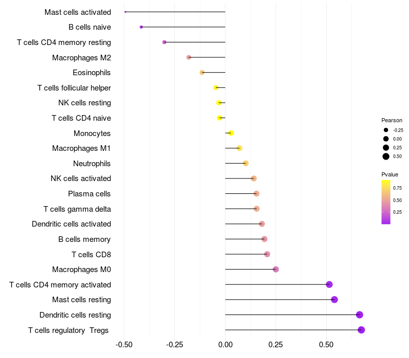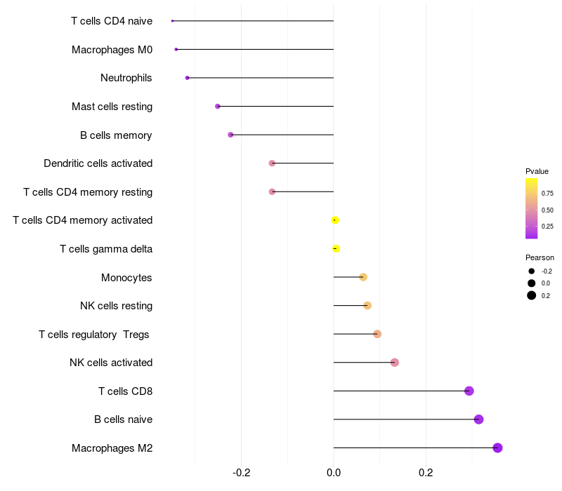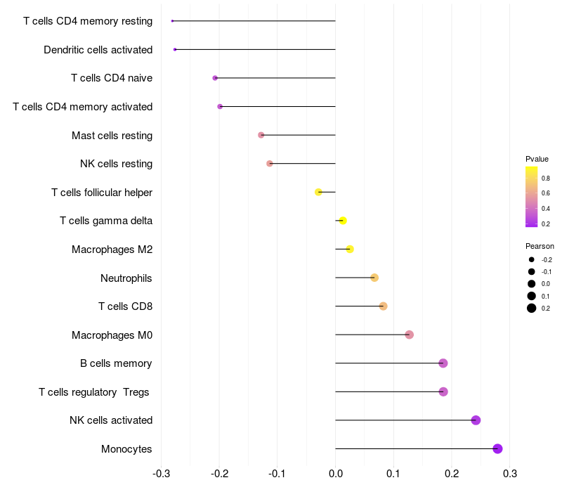 Lollipop of DHRS4L2 expression and immune infiltrating cell level correlation result in HTLV1+ samples