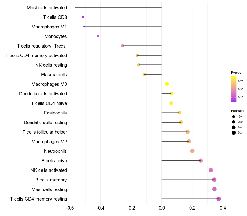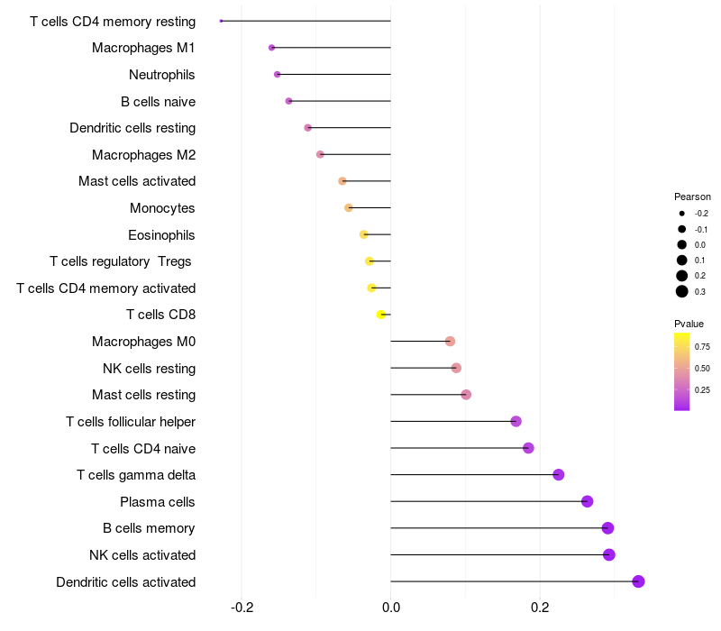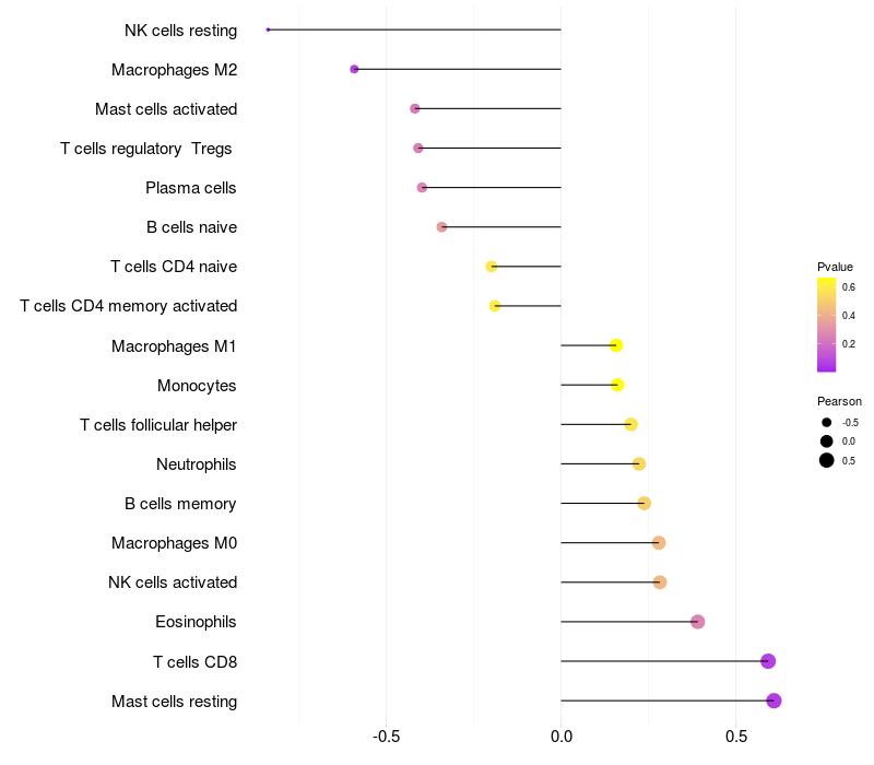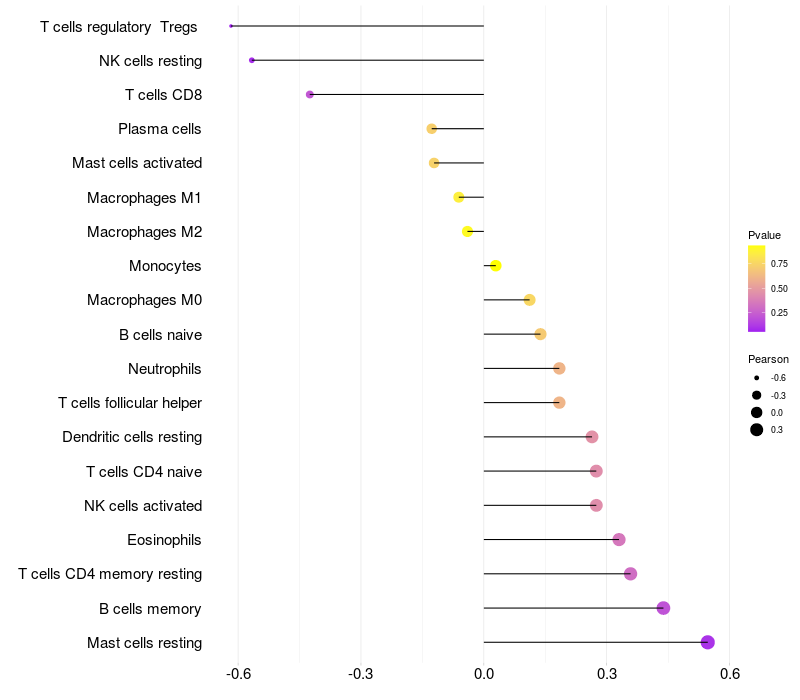 Lollipop of DHRS7B expression and immune infiltrating cell level correlation result in HBV+ Liver cirrhosis samples