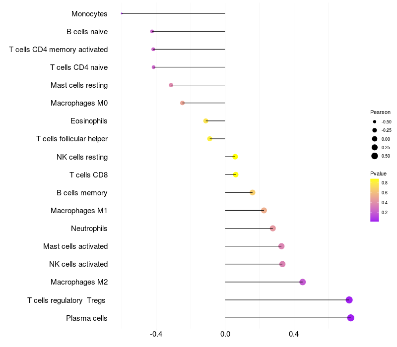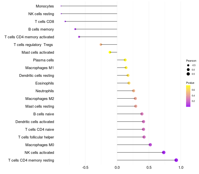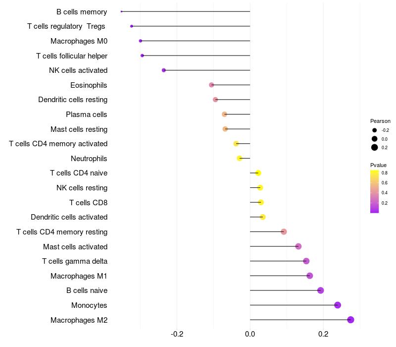 Lollipop of DIXDC1 expression and immune infiltrating cell level correlation result in HBV+ Liver cirrhosis samples