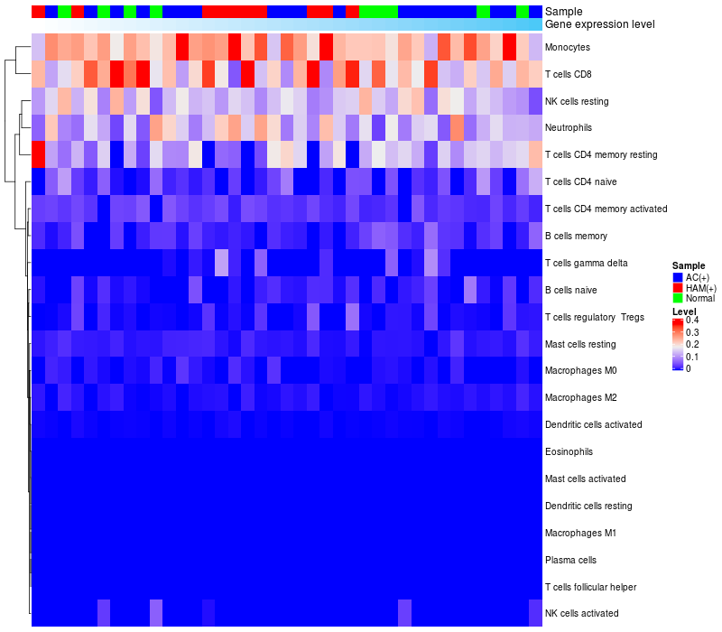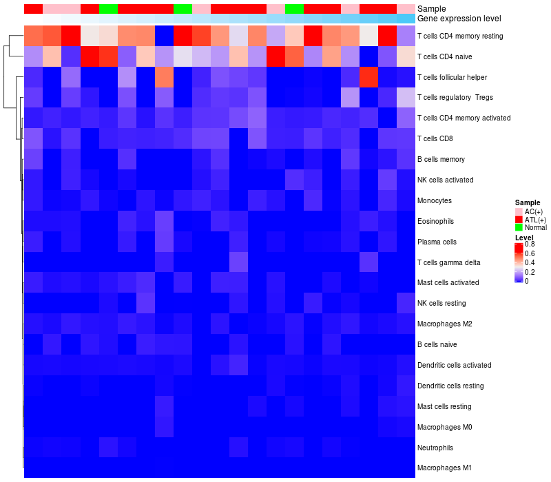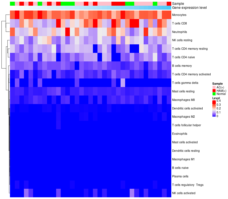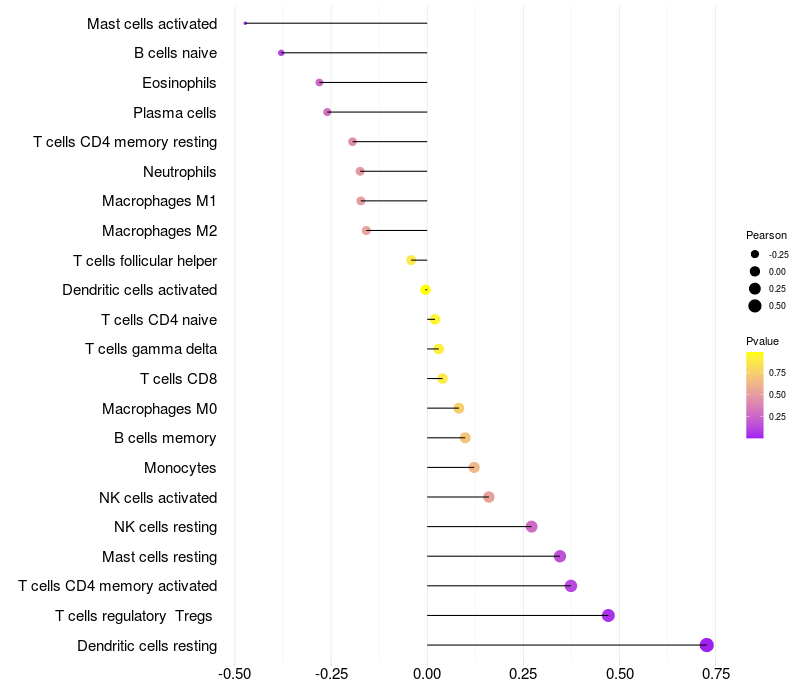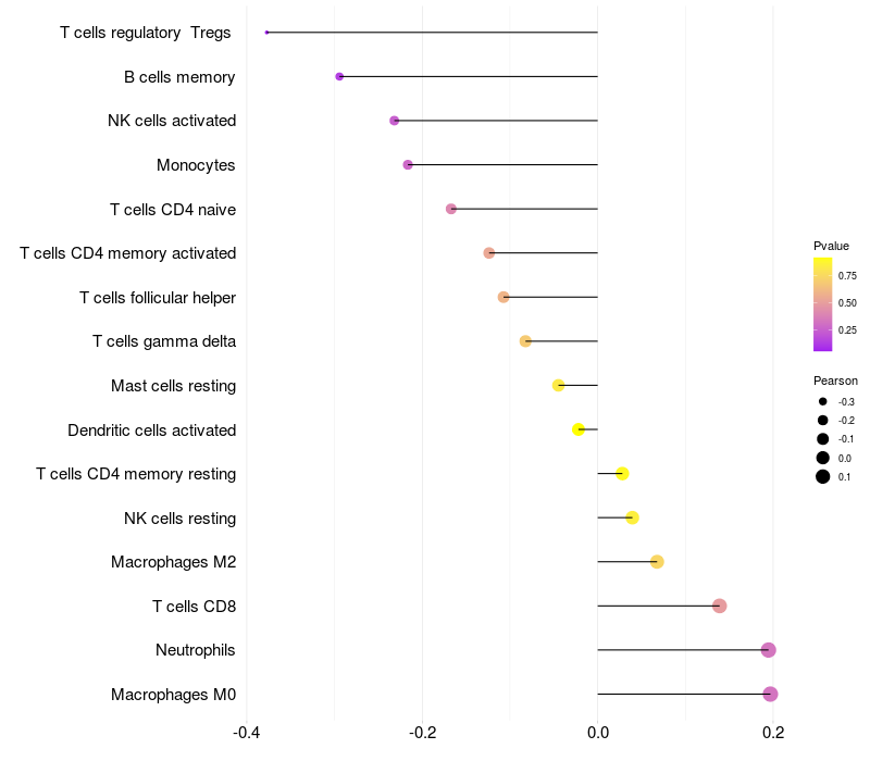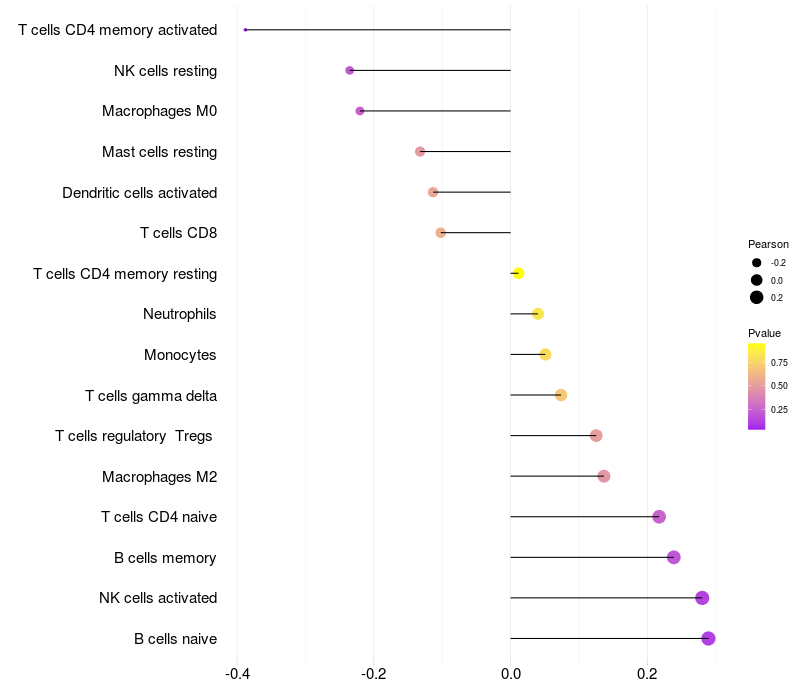 Lollipop of DKK4 expression and immune infiltrating cell level correlation result in HTLV1+ samples