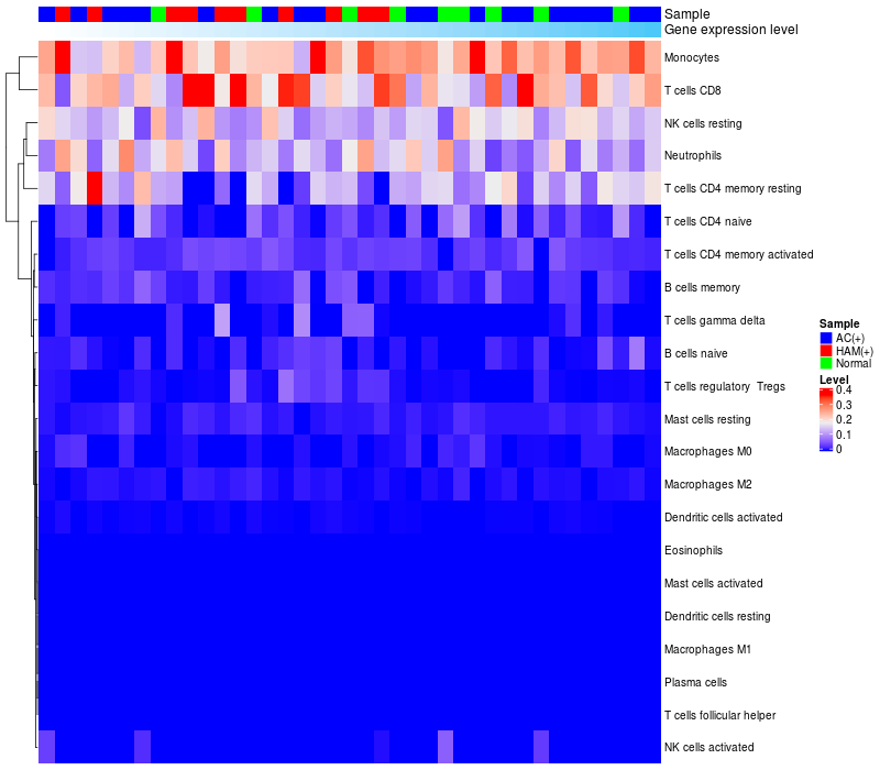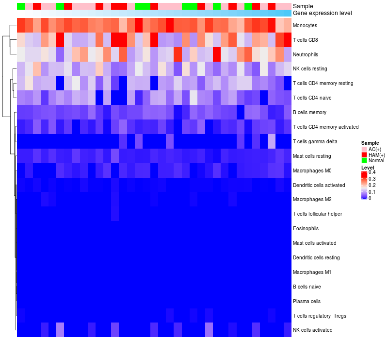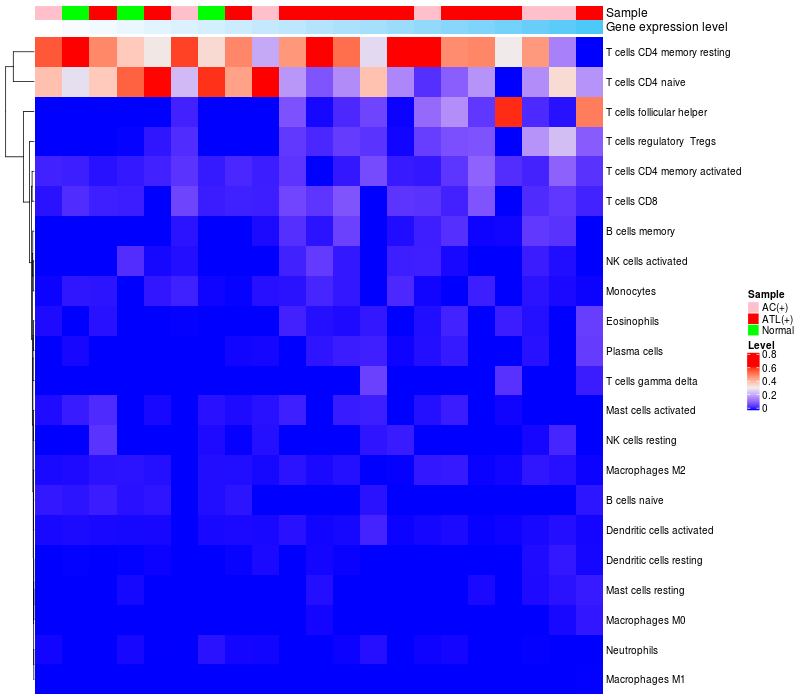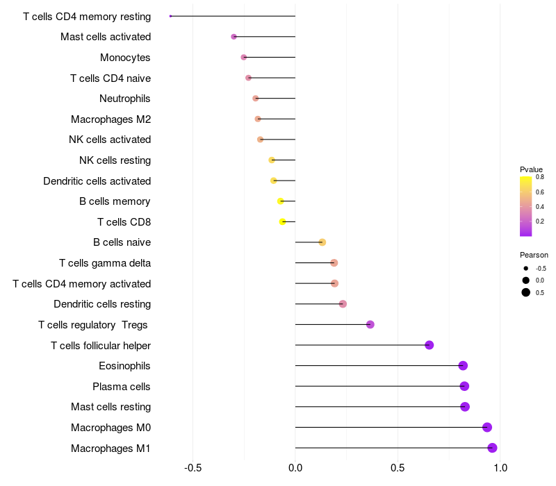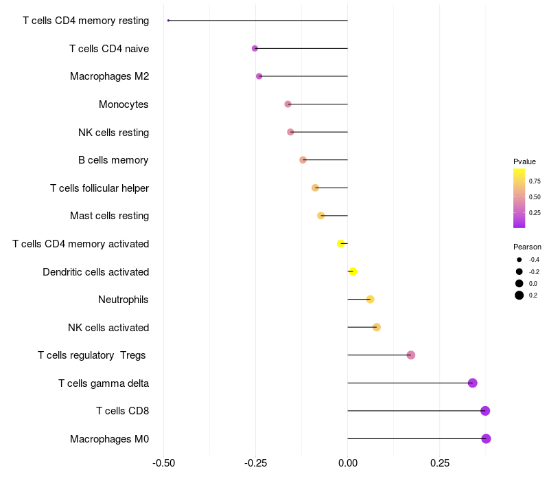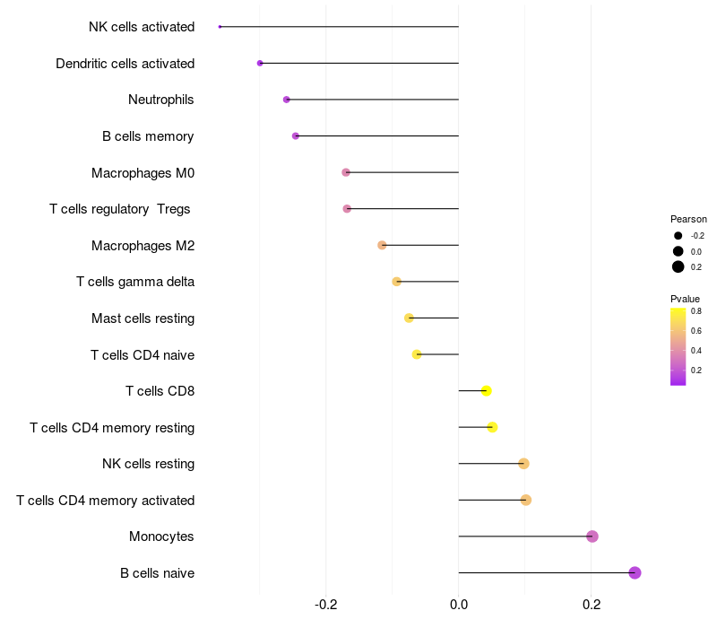 Lollipop of DLG5 expression and immune infiltrating cell level correlation result in HTLV1+ samples