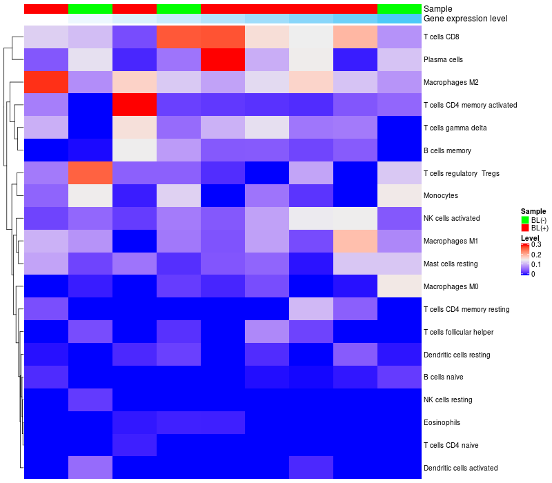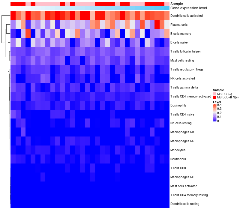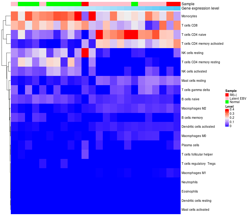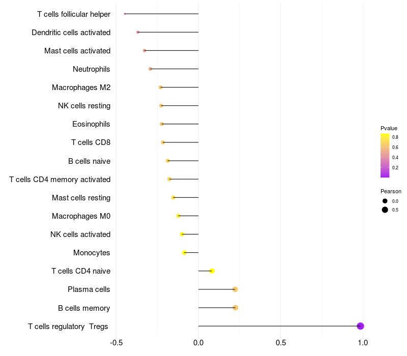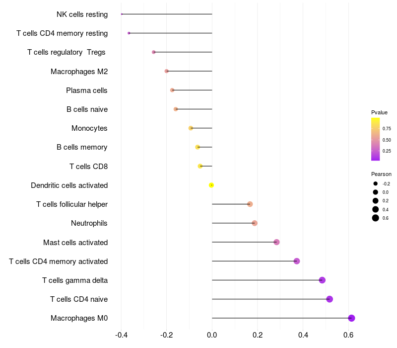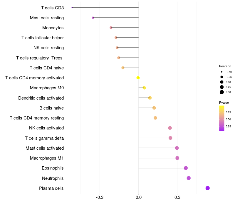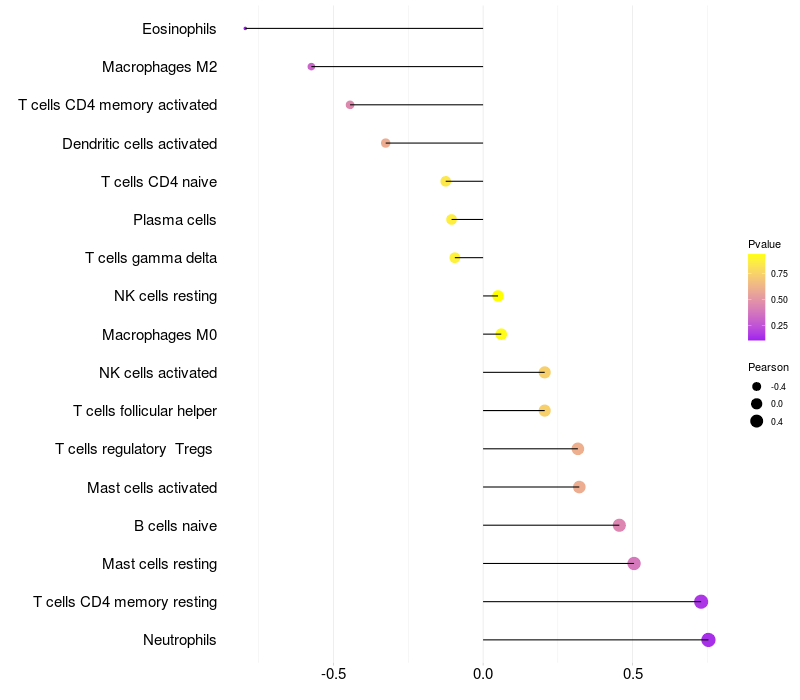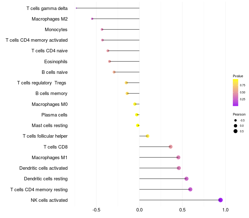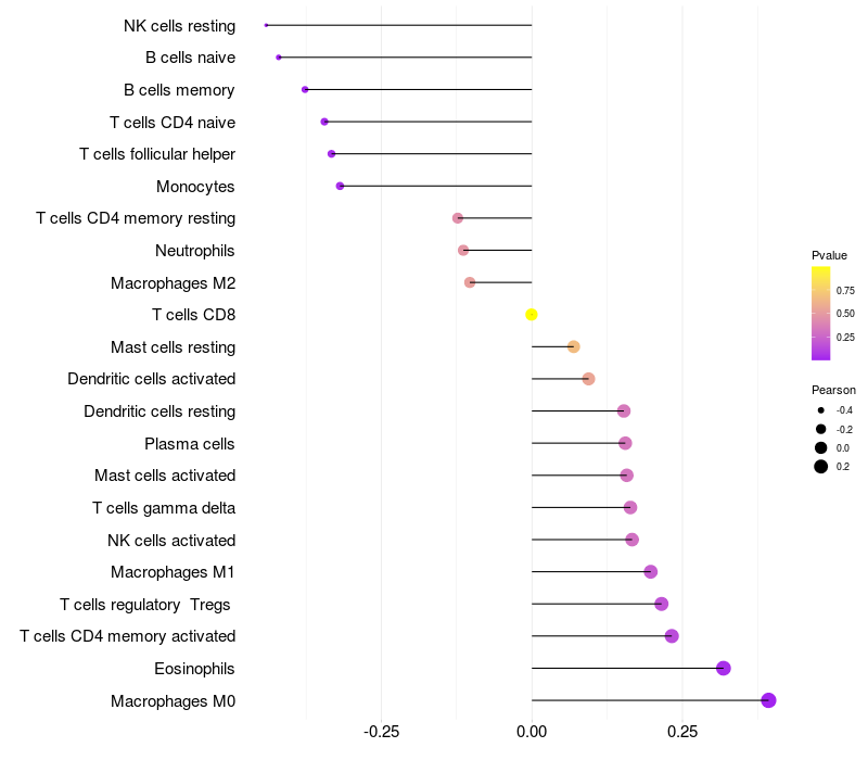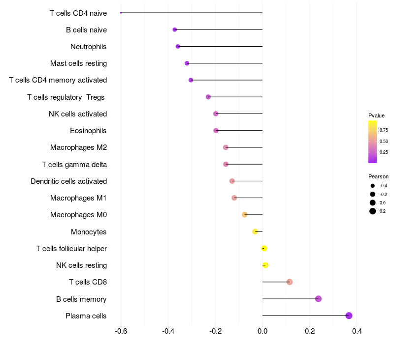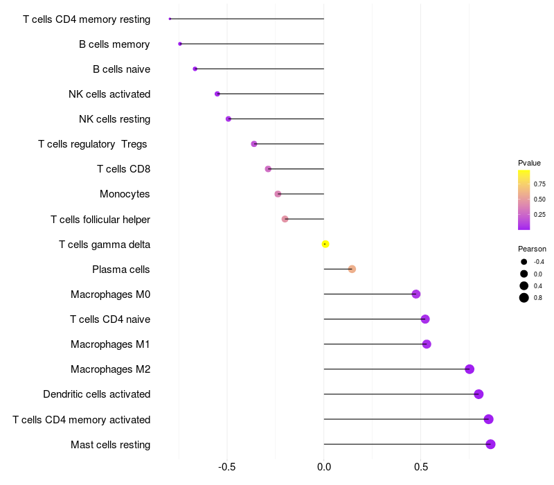 Lollipop of DMD expression and immune infiltrating cell level correlation result in EBV+ samples