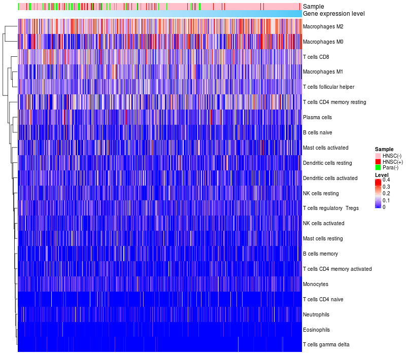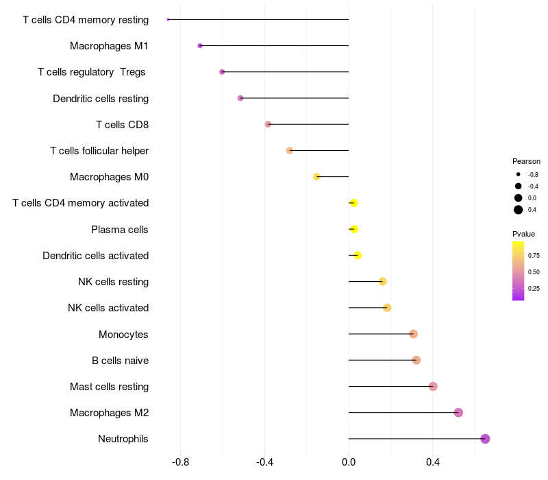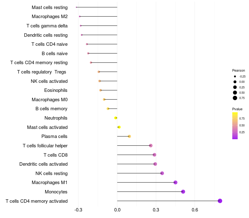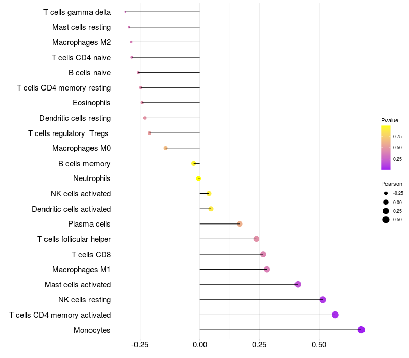 Lollipop of DMP1 expression and immune infiltrating cell level correlation result in HPV+ samples