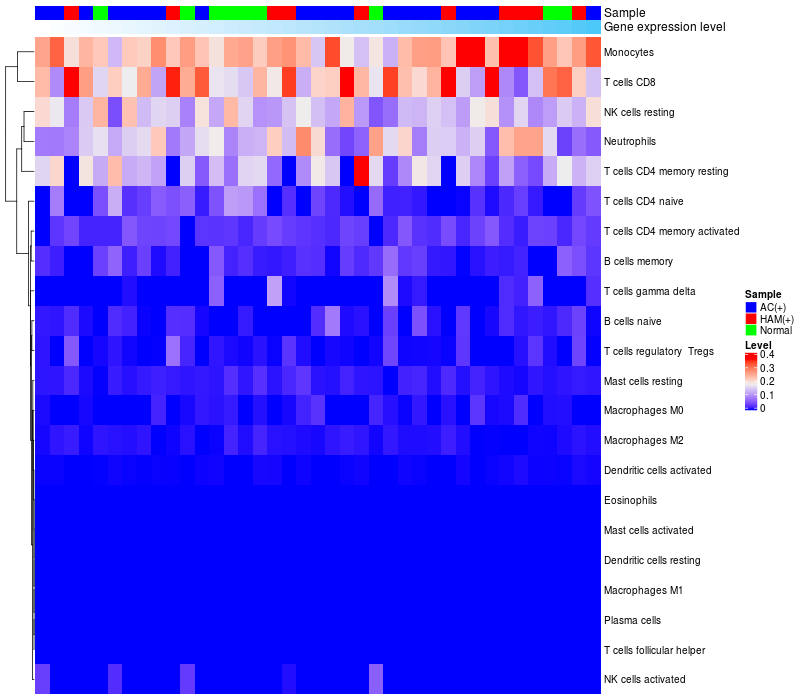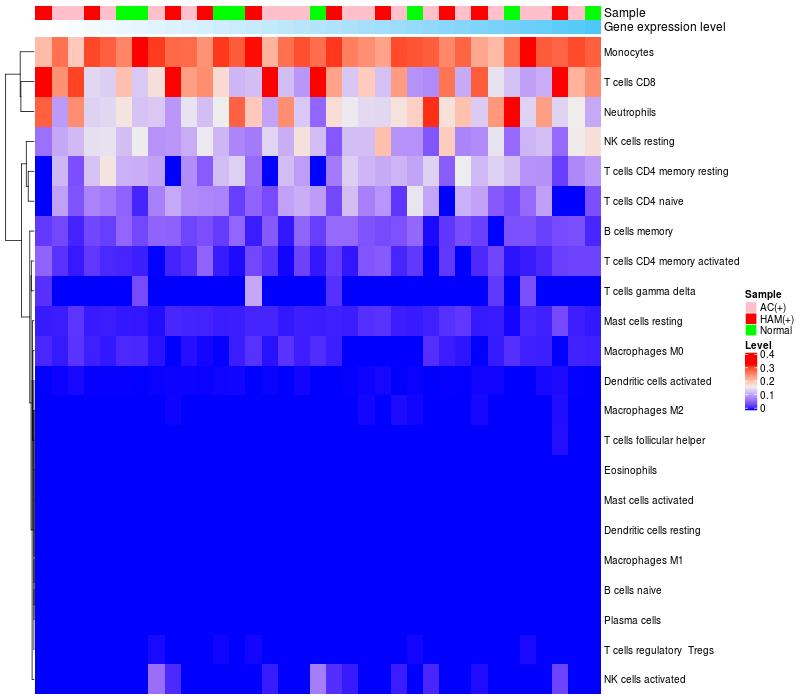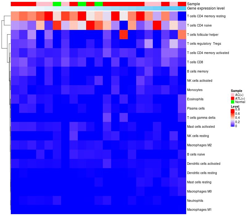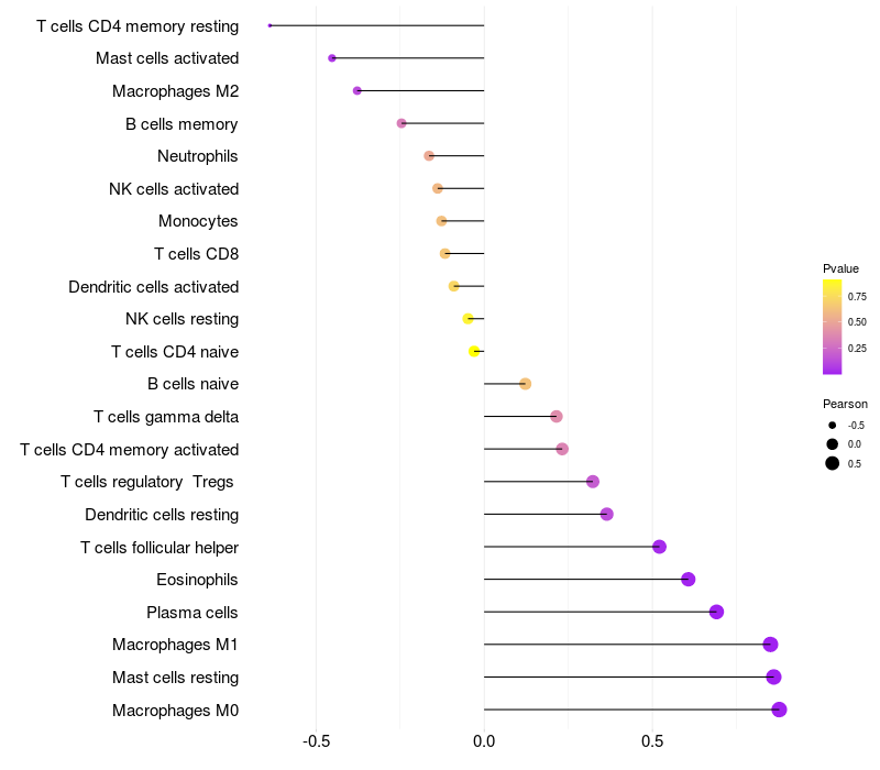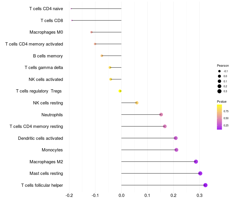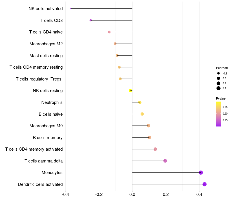 Lollipop of DMRT3 expression and immune infiltrating cell level correlation result in HTLV1+ samples