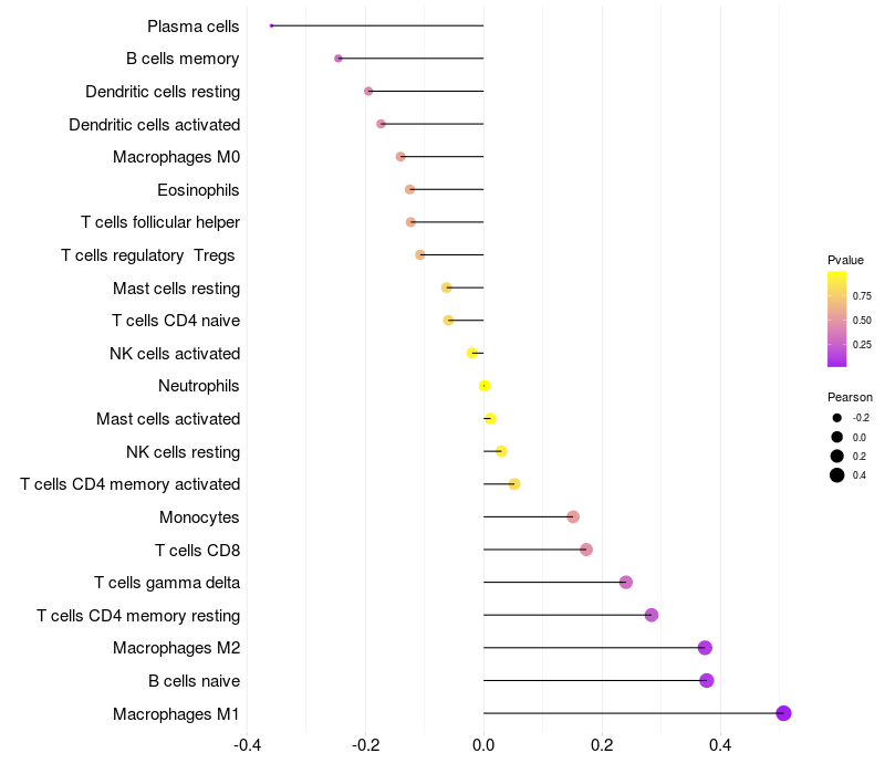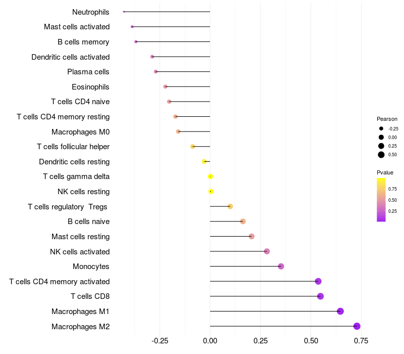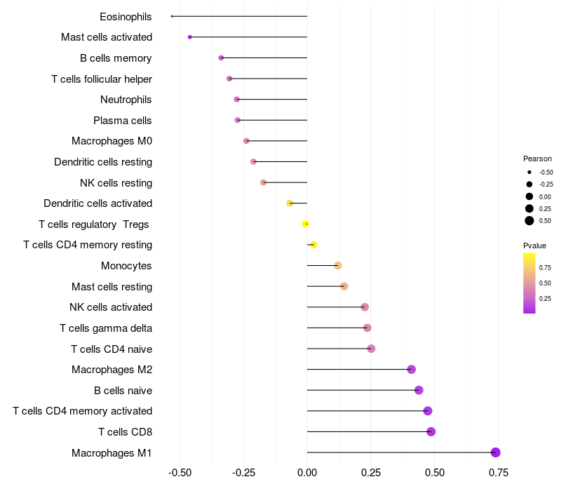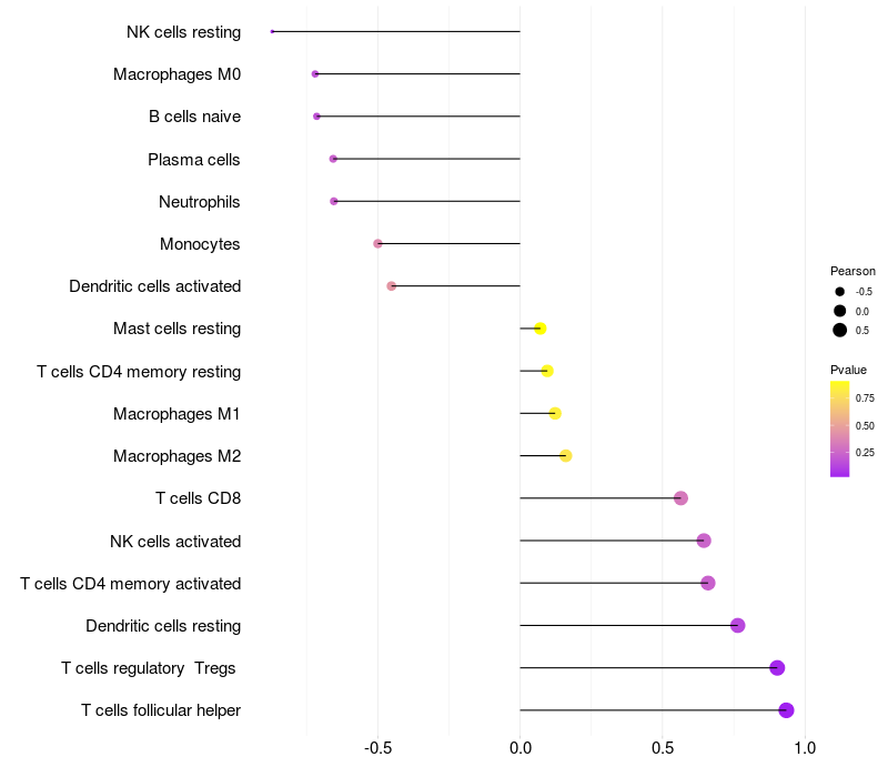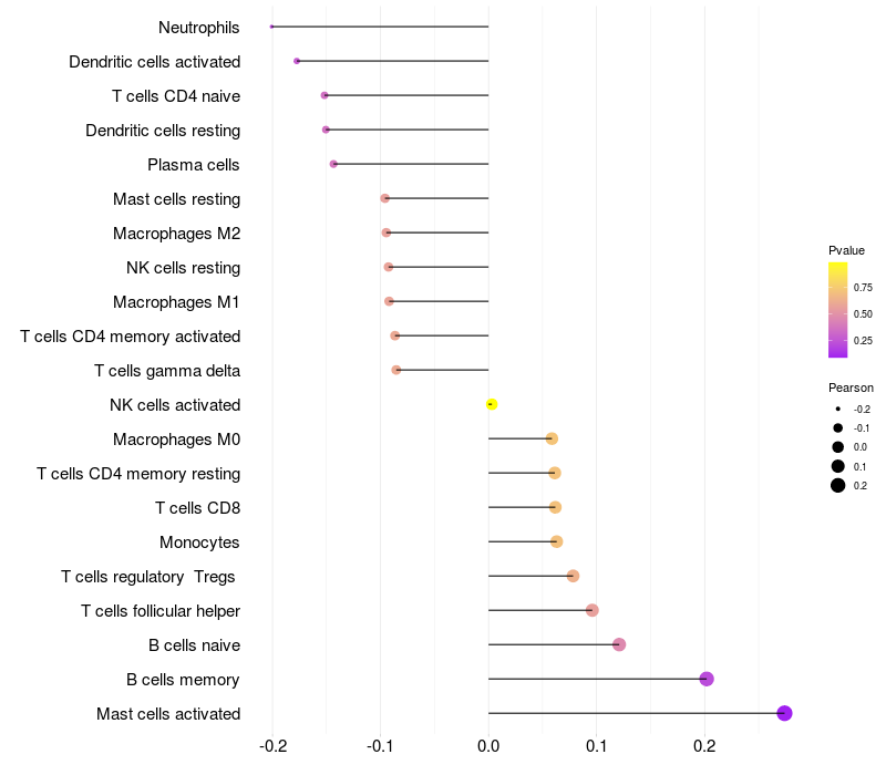 Lollipop of DNAH12 expression and immune infiltrating cell level correlation result in HPV+ samples