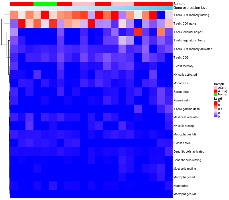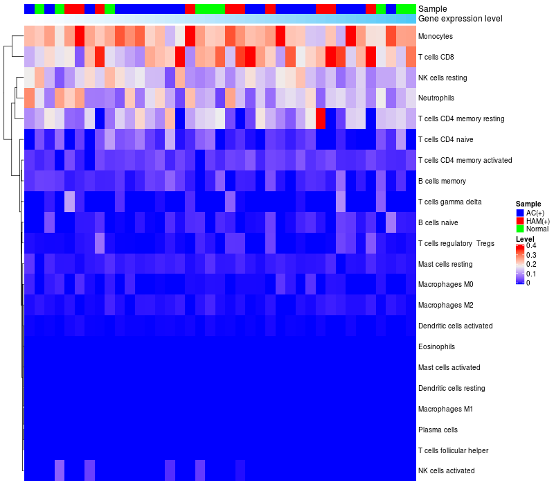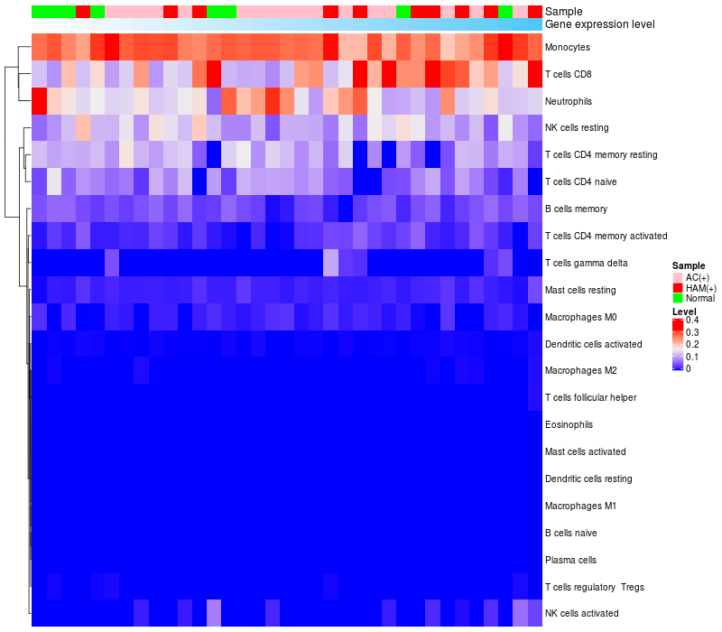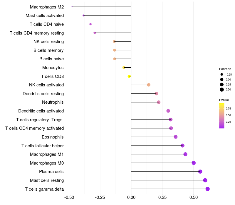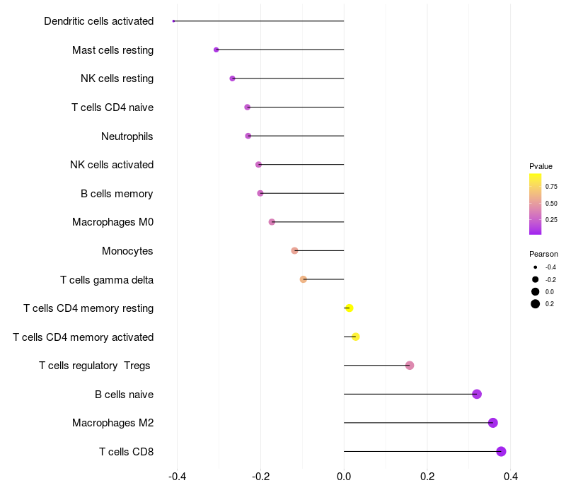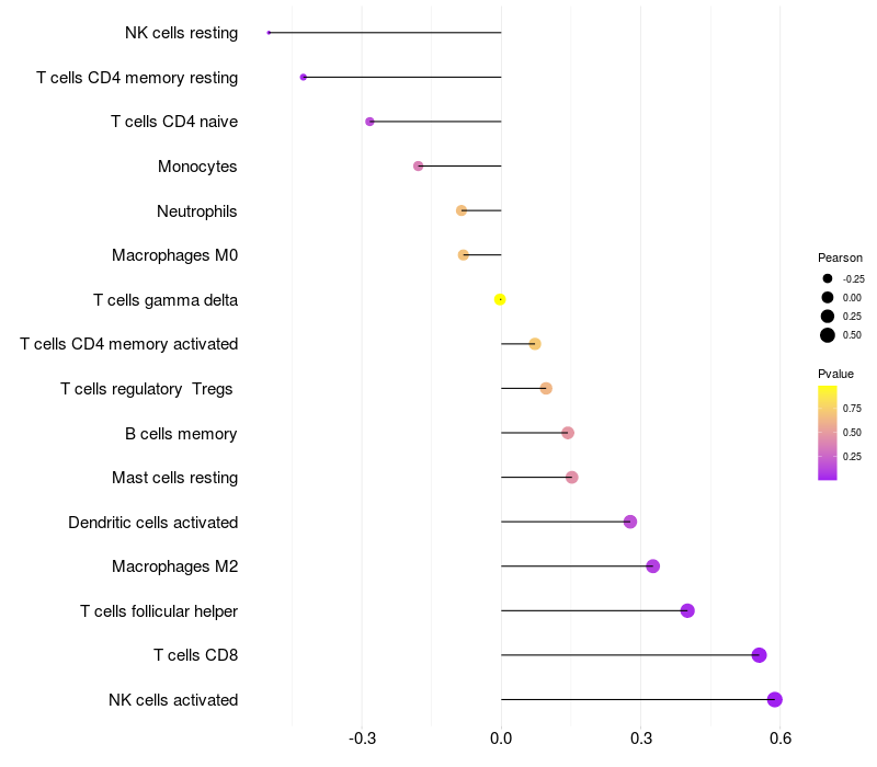 Lollipop of DNAJA2 expression and immune infiltrating cell level correlation result in HTLV1+ samples