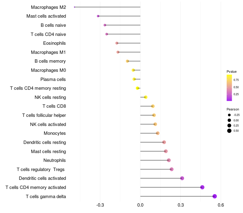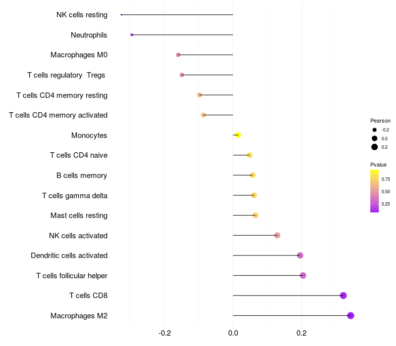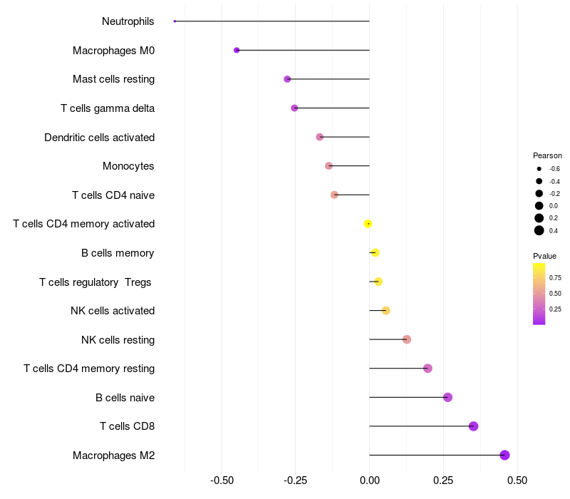 Lollipop of DNAJC10 expression and immune infiltrating cell level correlation result in HTLV1+ samples