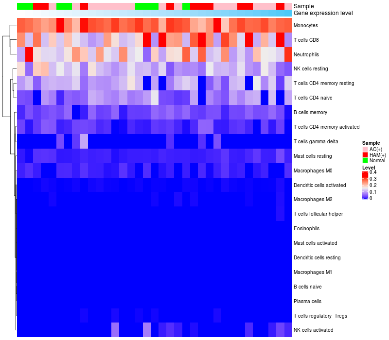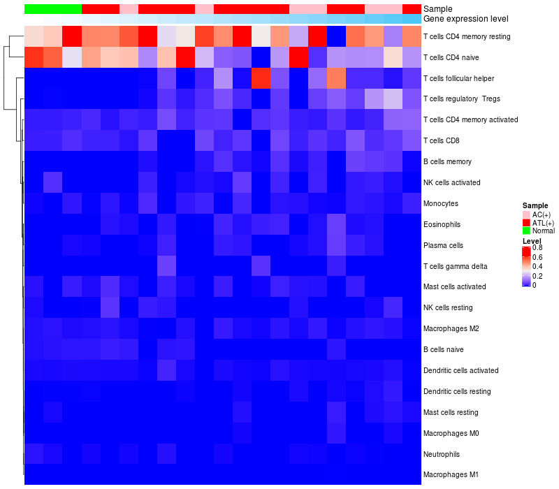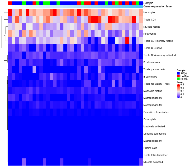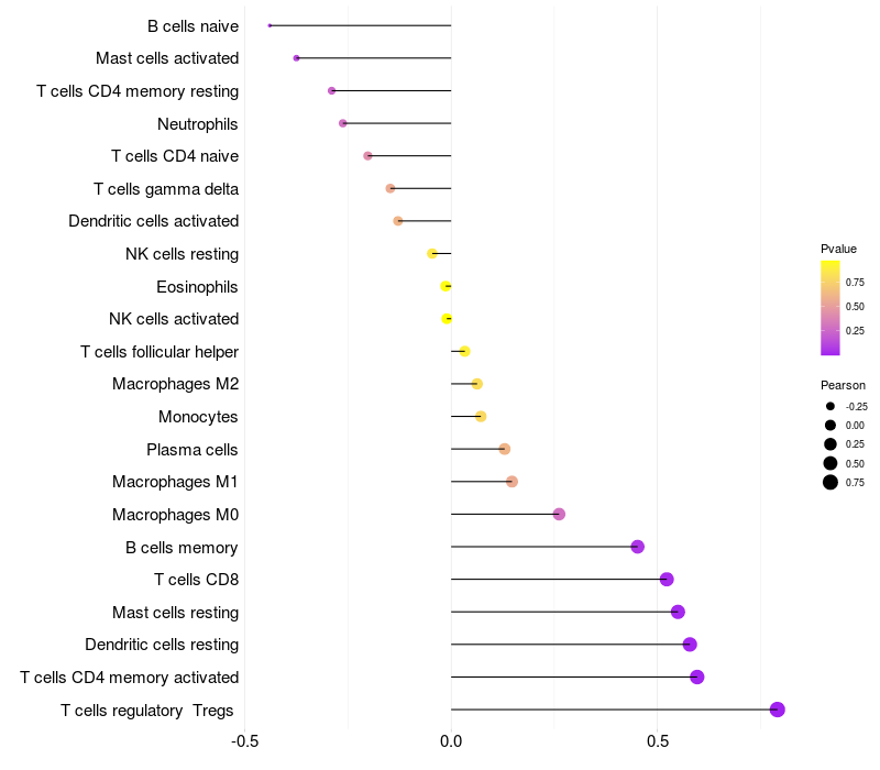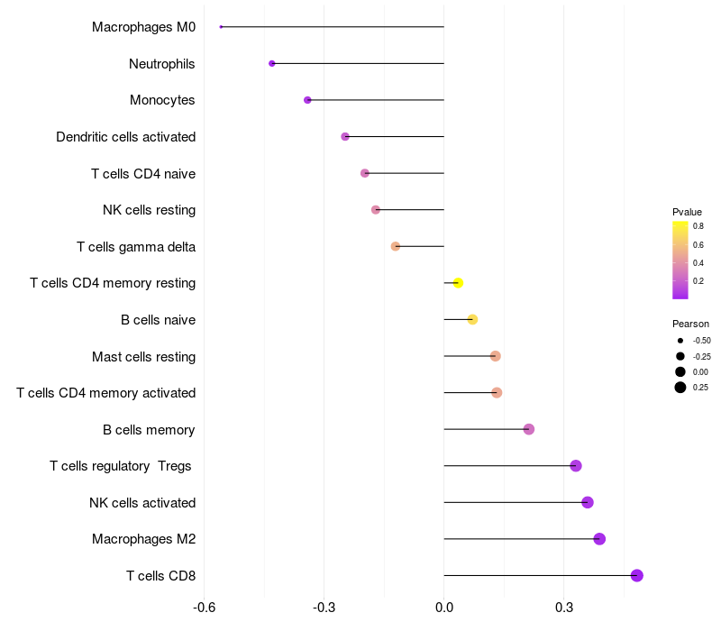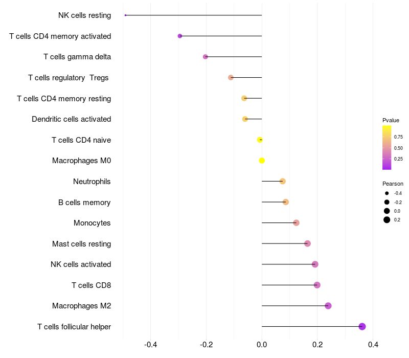 Lollipop of DNAJC18 expression and immune infiltrating cell level correlation result in HTLV1+ samples