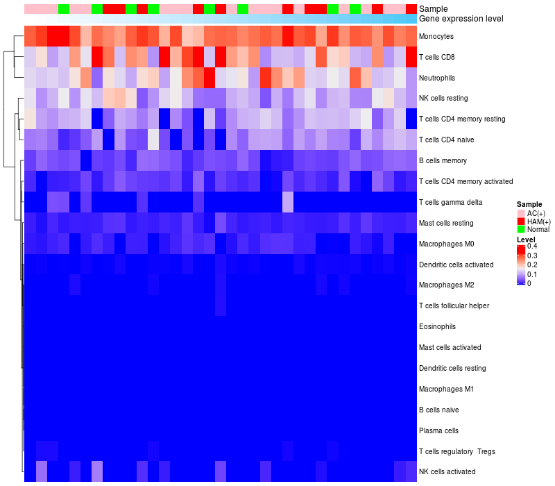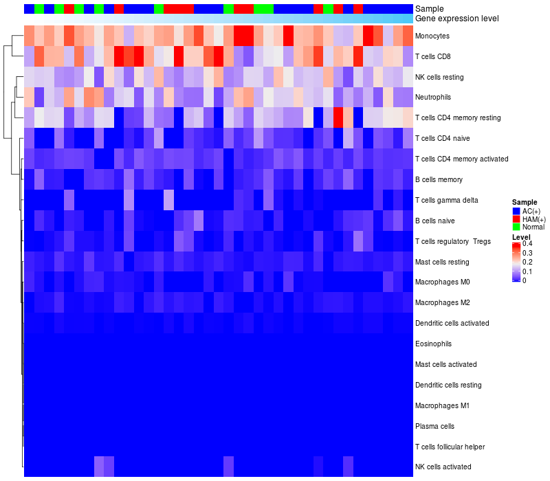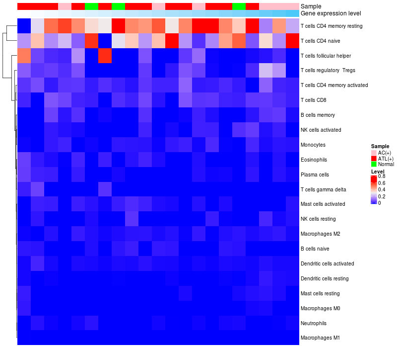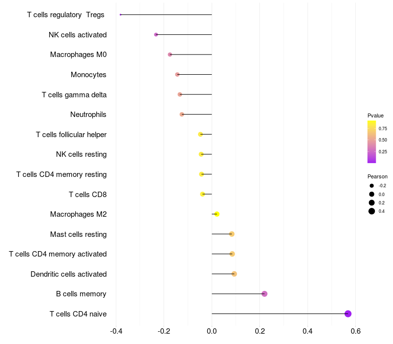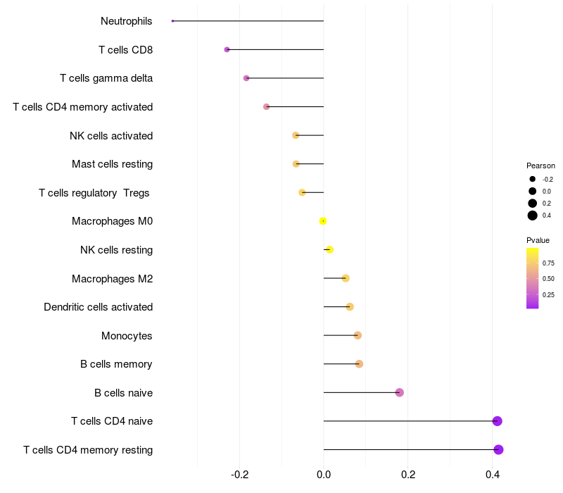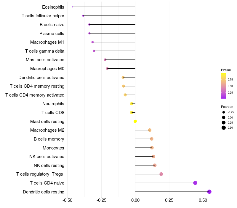 Lollipop of DNHD1 expression and immune infiltrating cell level correlation result in HTLV1+ samples