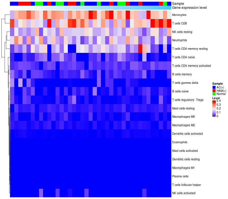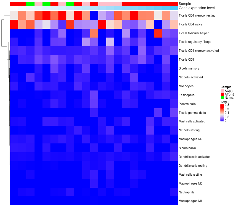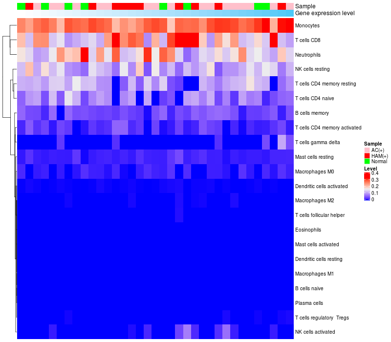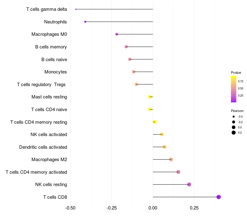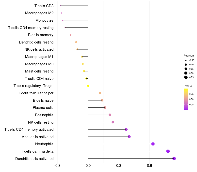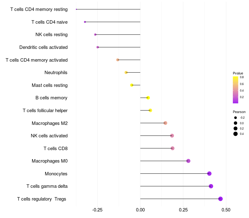 Lollipop of DNTTIP2 expression and immune infiltrating cell level correlation result in HTLV1+ samples