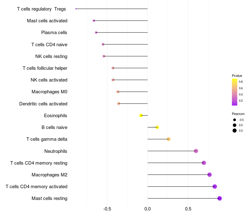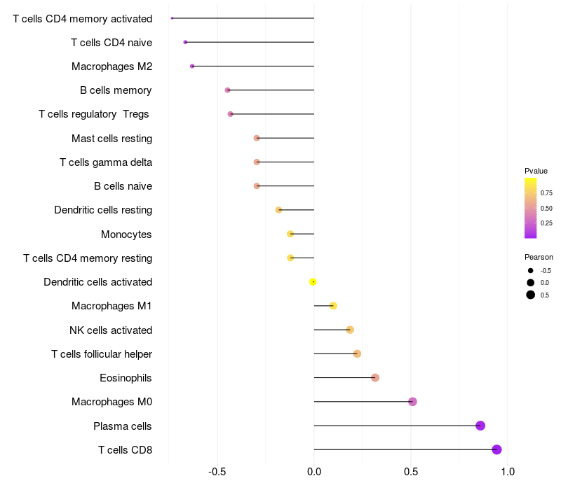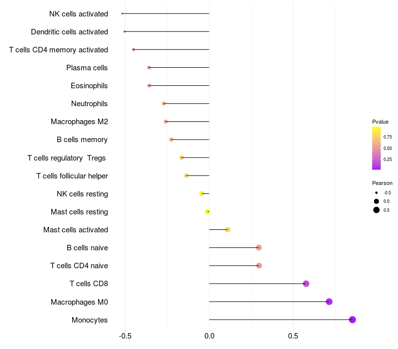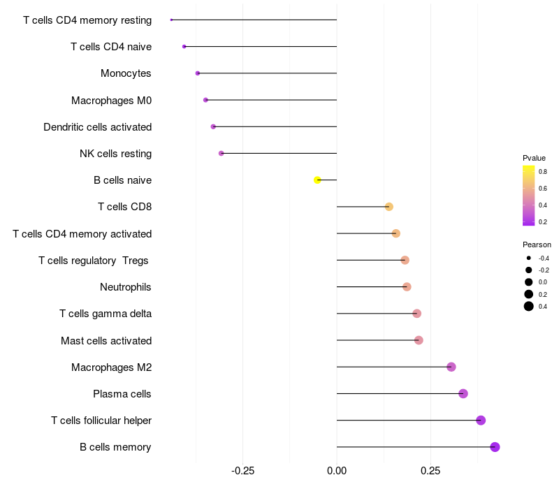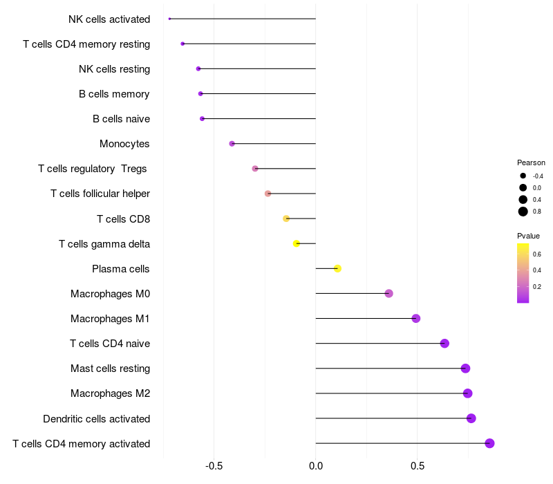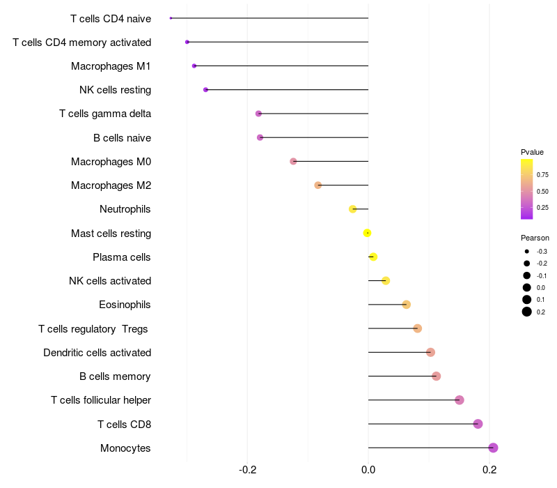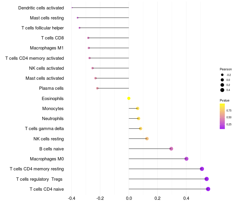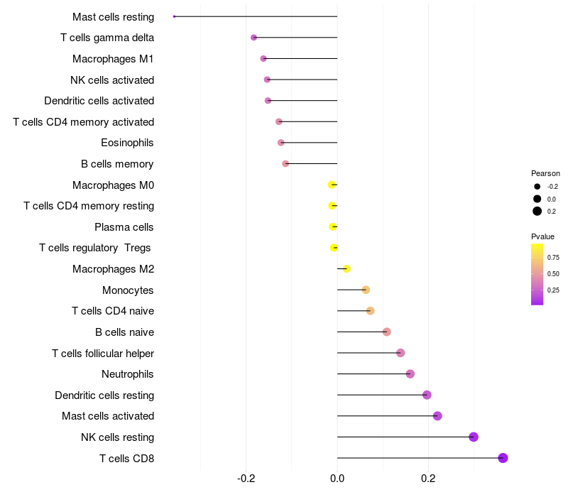 Lollipop of DPP6 expression and immune infiltrating cell level correlation result in EBV+ samples