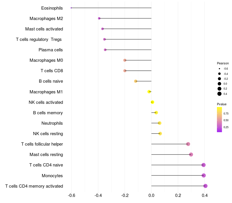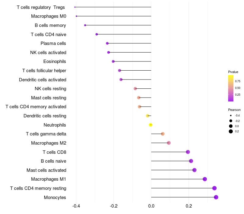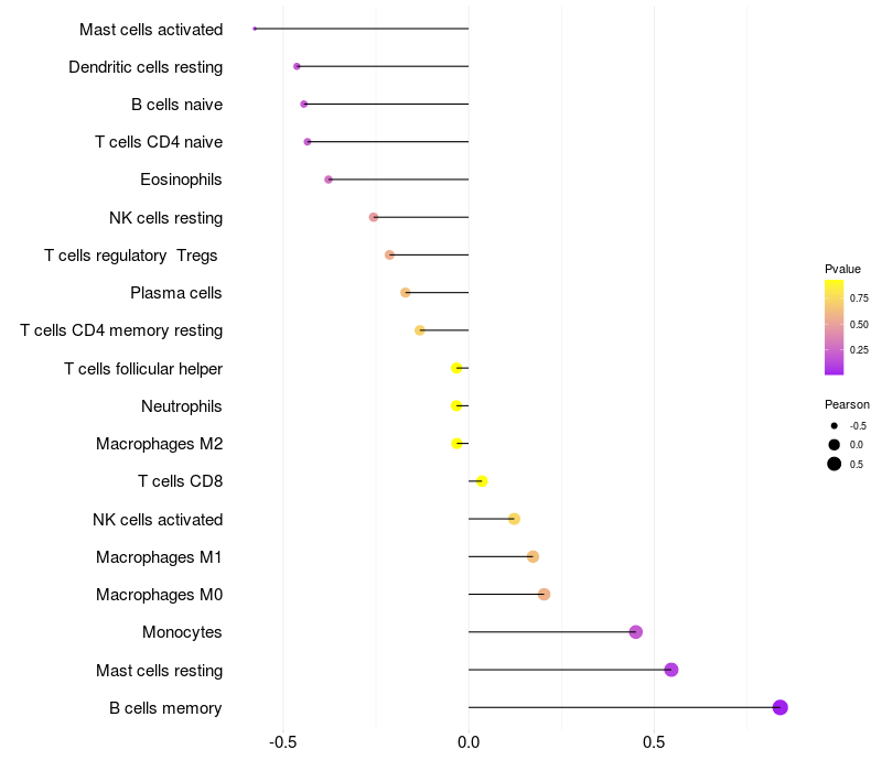 Lollipop of DPYD expression and immune infiltrating cell level correlation result in HBV+ Liver cirrhosis samples