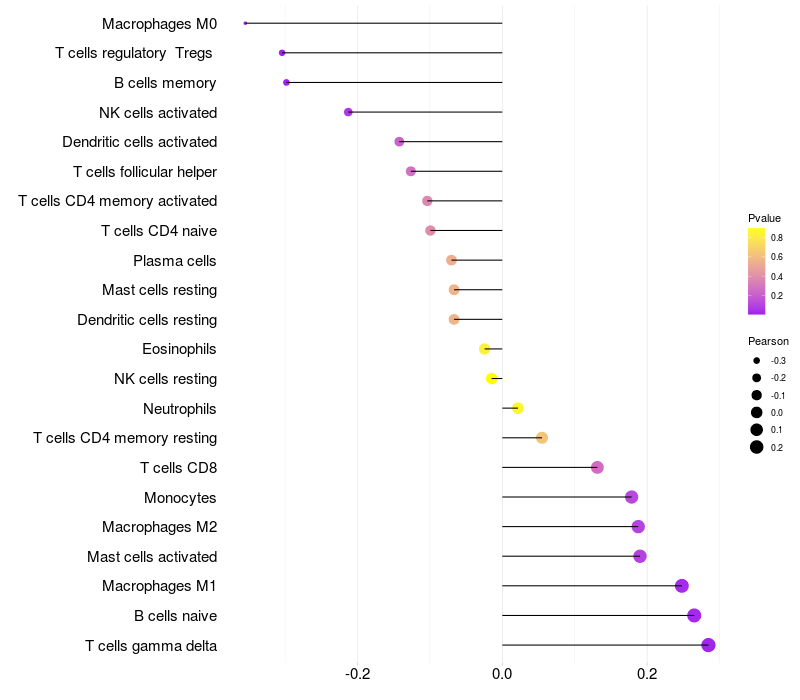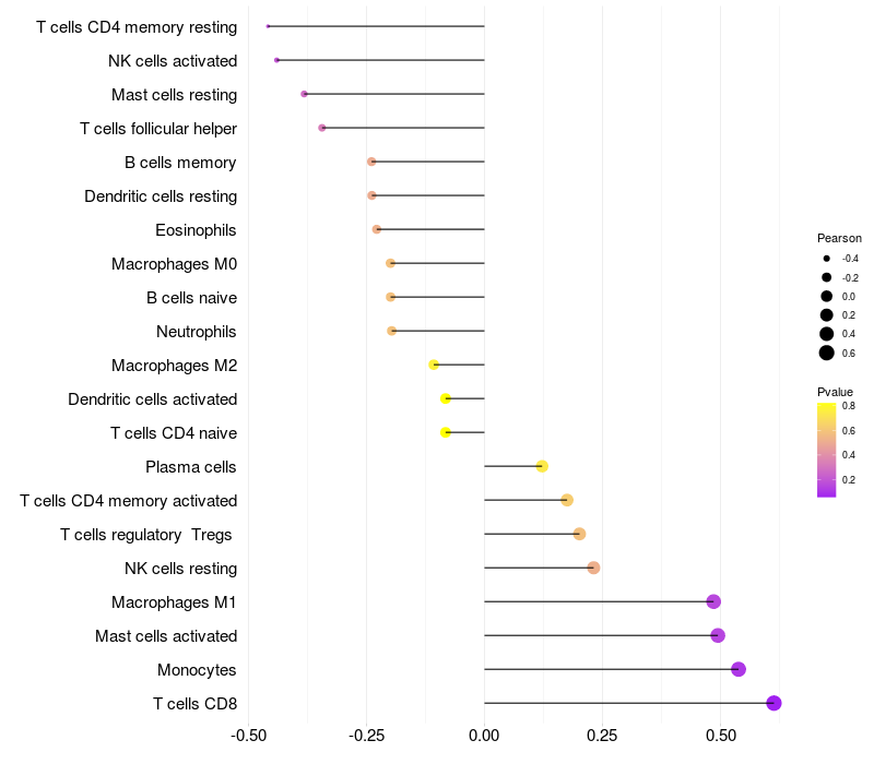 Lollipop of DSCAM expression and immune infiltrating cell level correlation result in HBV+ Chronic HBV (CHB) infection samples