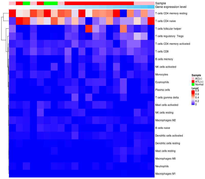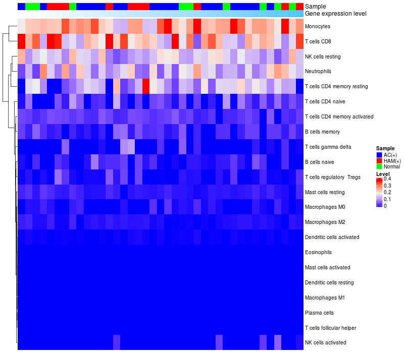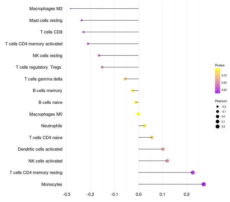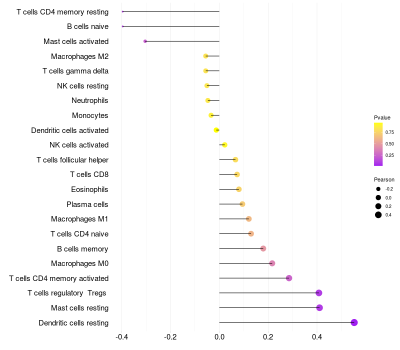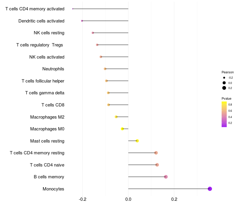 Lollipop of DSCR4 expression and immune infiltrating cell level correlation result in HTLV1+ samples