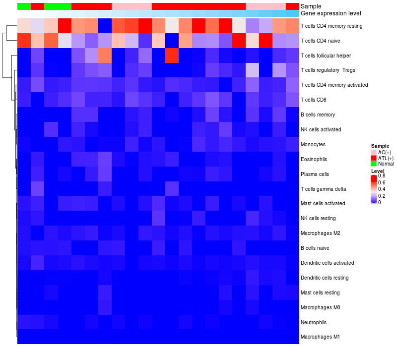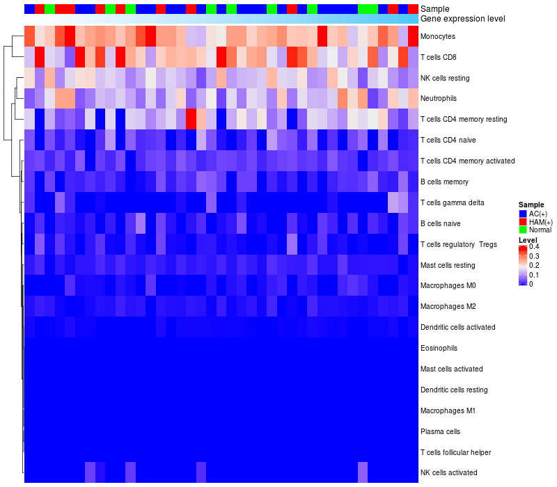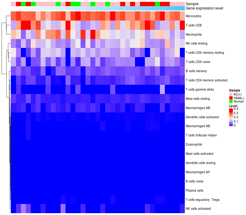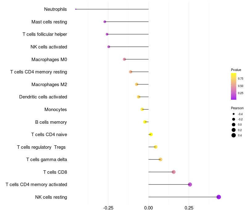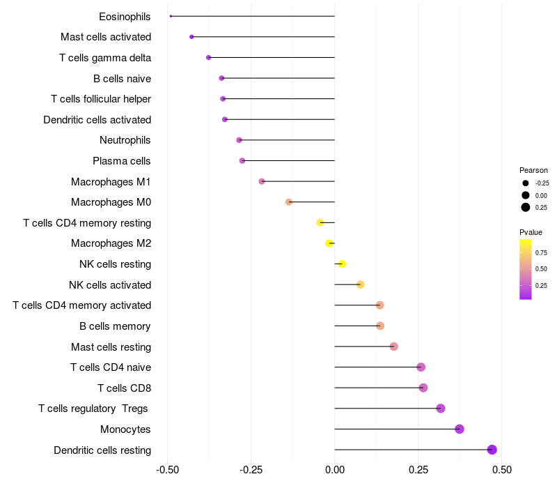 Lollipop of DSCR9 expression and immune infiltrating cell level correlation result in HTLV1+ samples