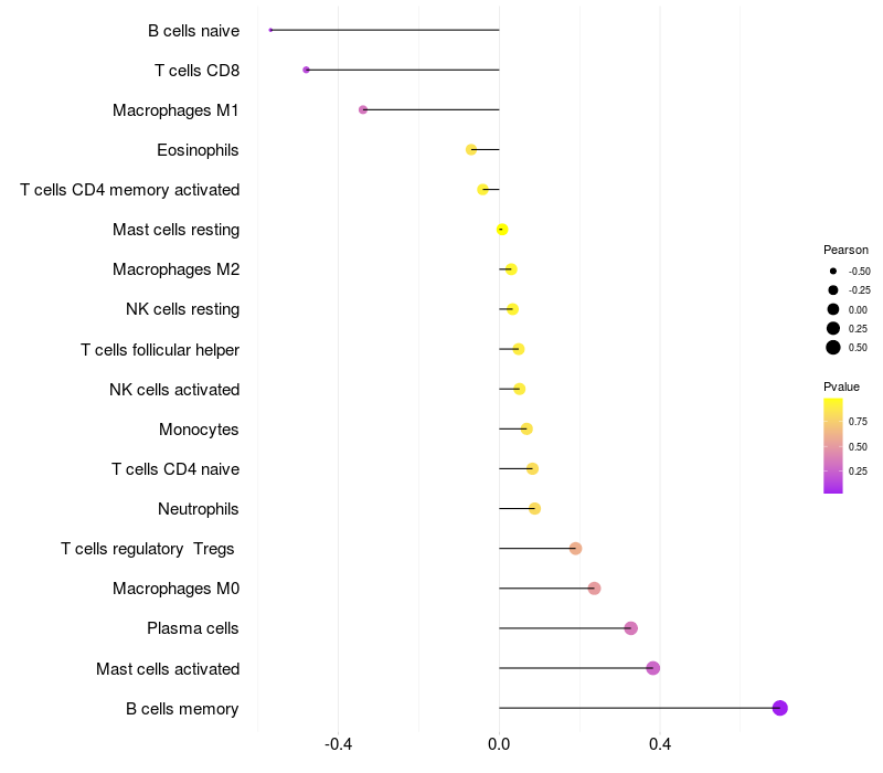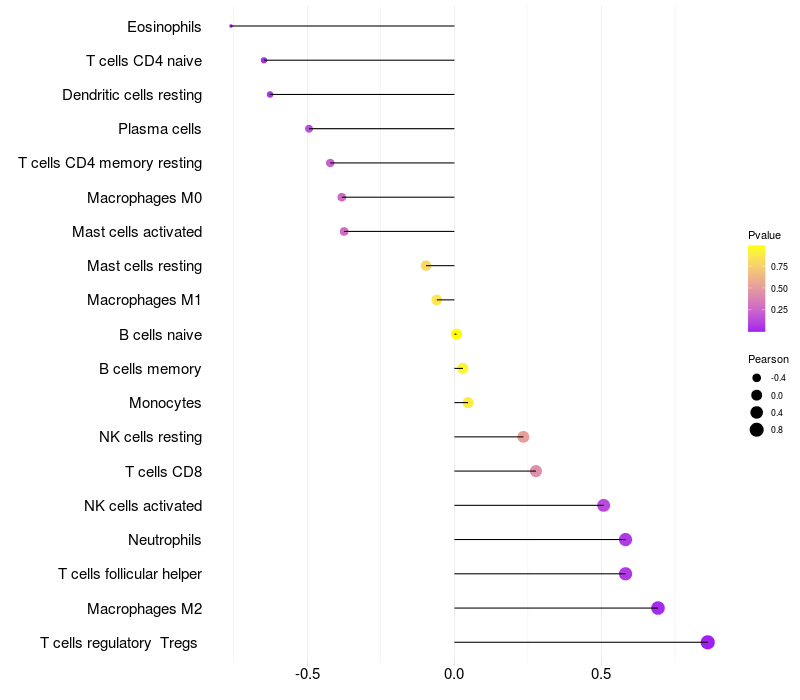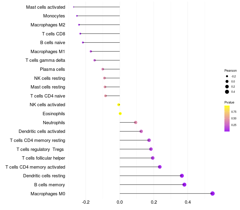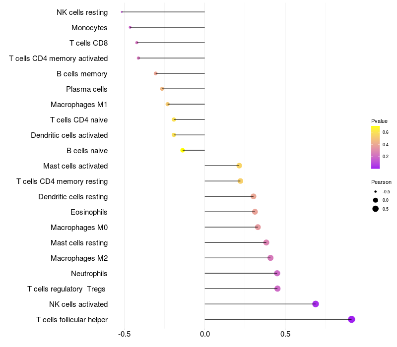Lollipop of DTL expression and immune infiltrating cell level correlation result in HBV+ Liver cirrhosis samples