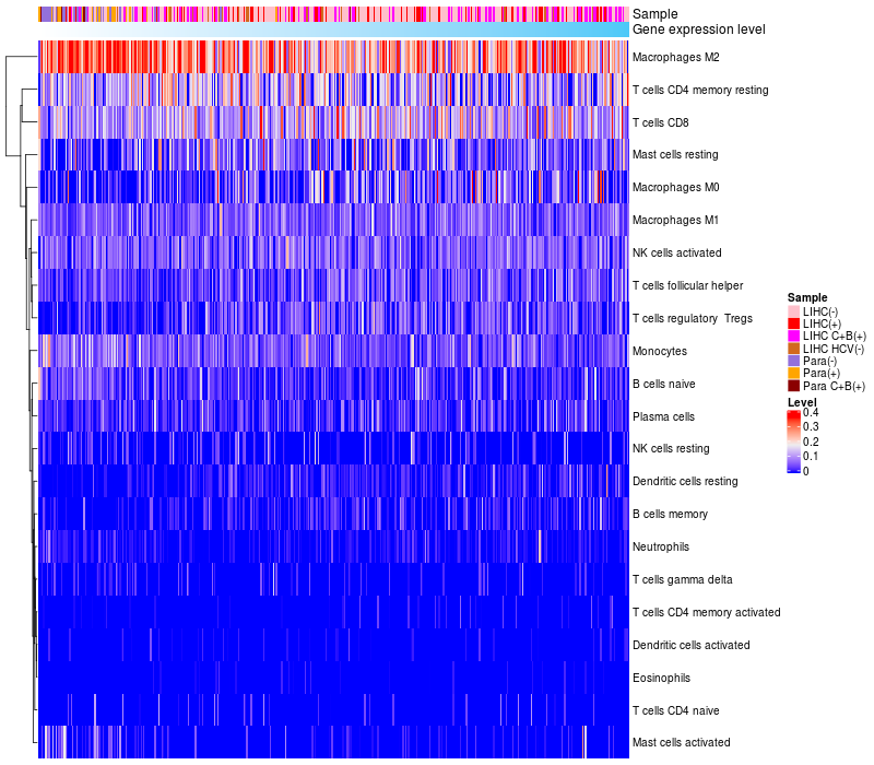 Liver hepatocellular carcinoma HCV (HBV+)(86), Liver hepatocellular carcinoma HCV (HBV-)(19), Liver hepatocellular carcinoma (HBV+)(209), Liver hepatocellular carcinoma (HBV+)(60), Paracancerous HCV (HBV+)(4), Paracancerous (HBV-)(28), Paracancerous (HBV+)(18) |