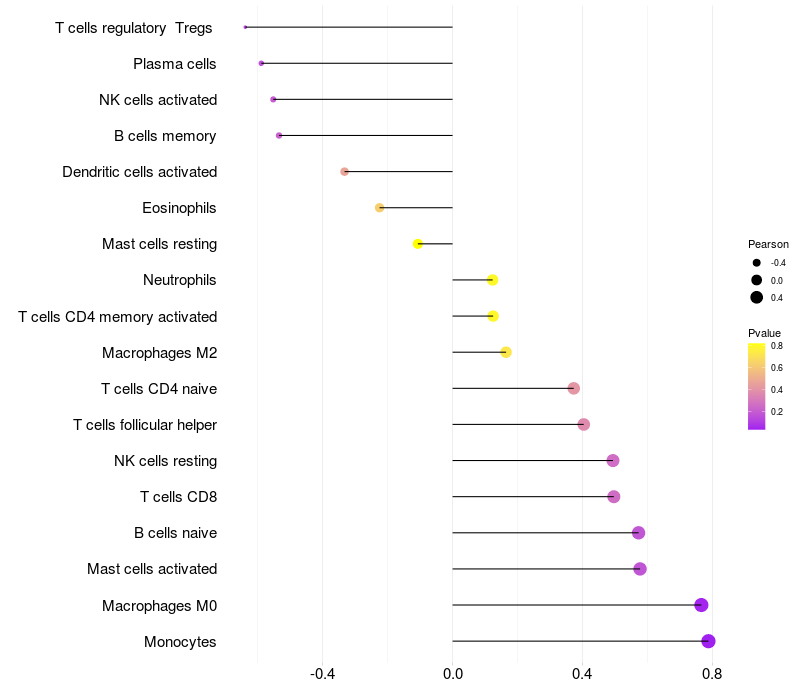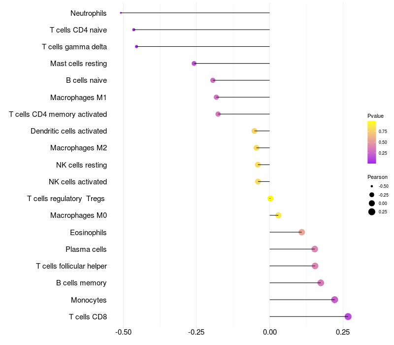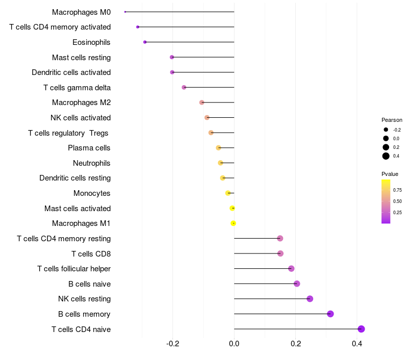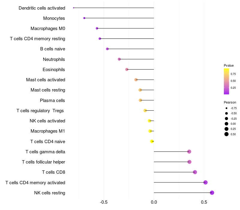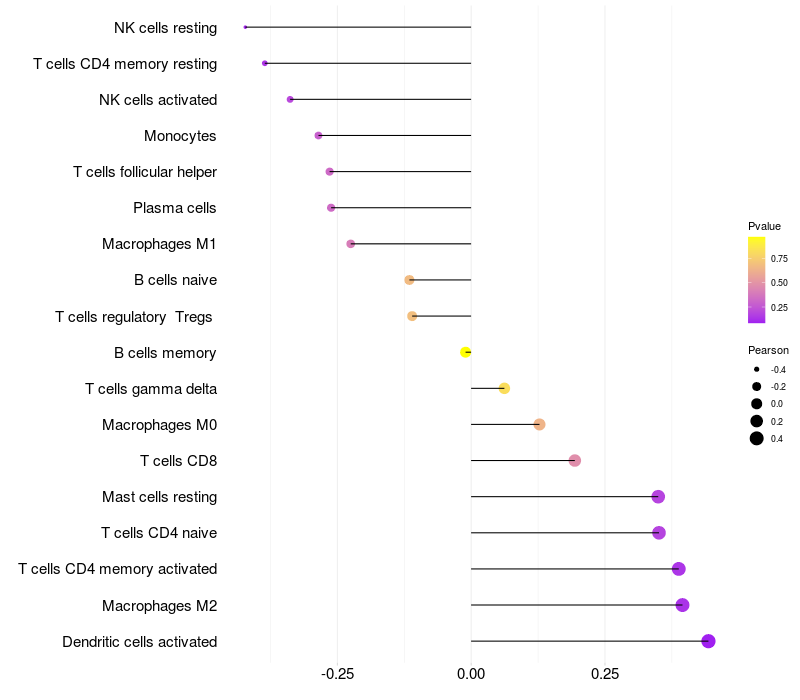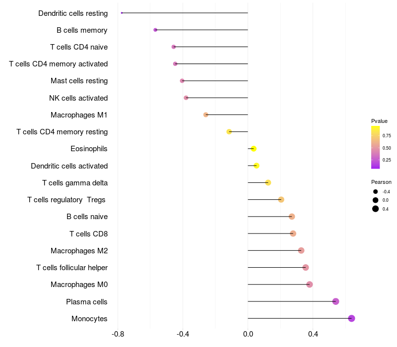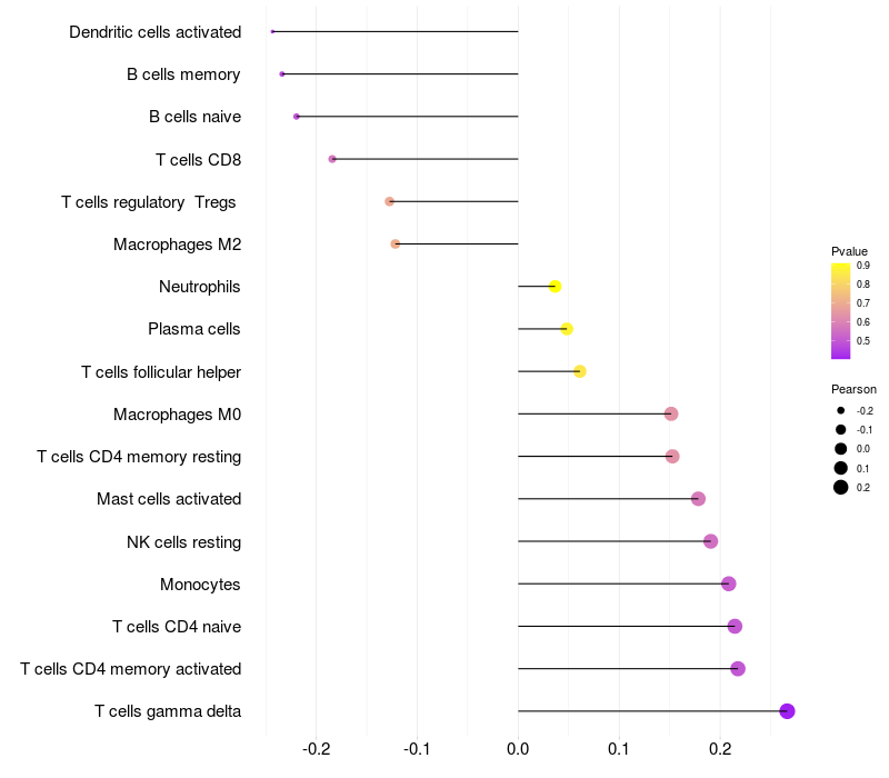 Lollipop of DTX3 expression and immune infiltrating cell level correlation result in EBV+ samples