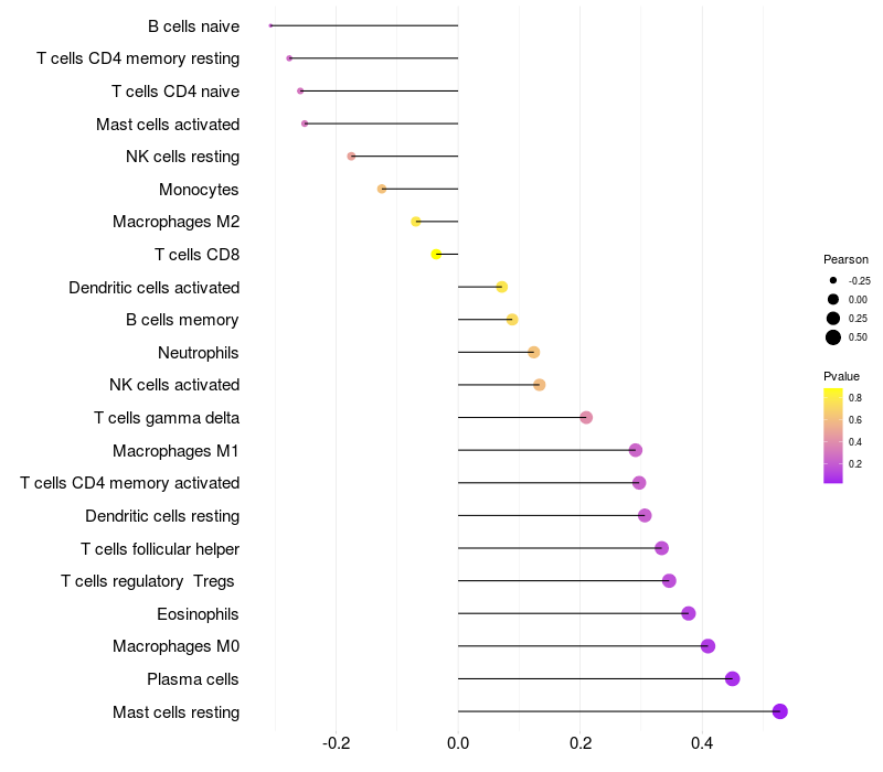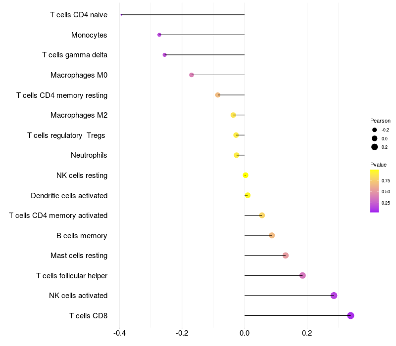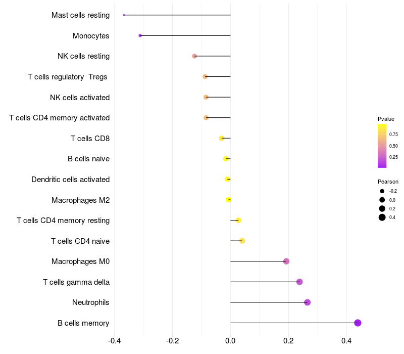 Lollipop of DTX4 expression and immune infiltrating cell level correlation result in HTLV1+ samples