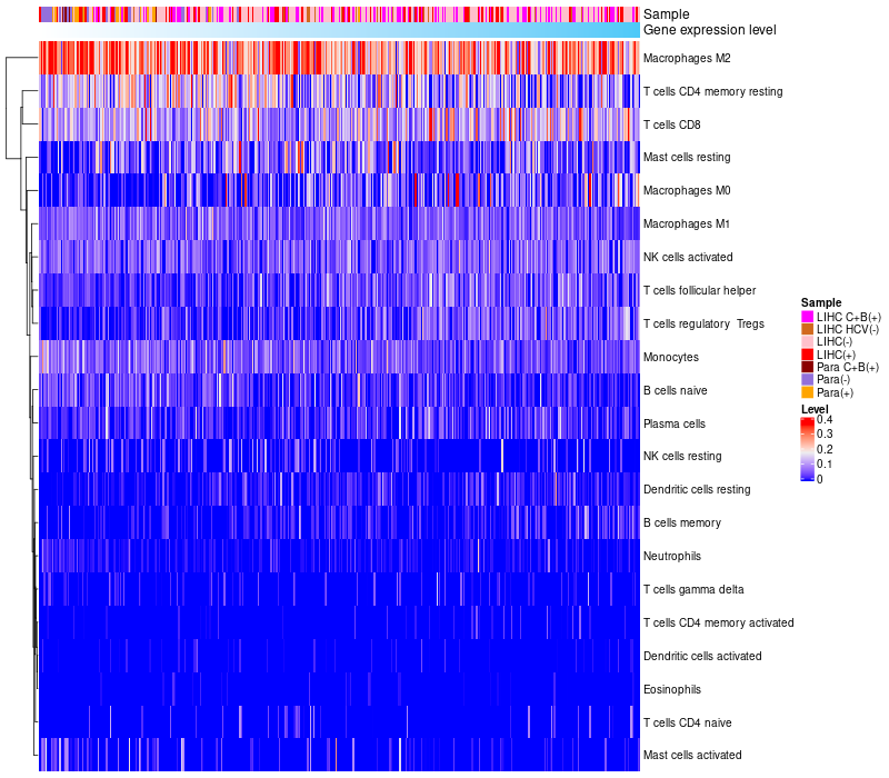 Liver hepatocellular carcinoma HCV (HBV+)(86), Liver hepatocellular carcinoma HCV (HBV-)(19), Liver hepatocellular carcinoma (HBV+)(209), Liver hepatocellular carcinoma (HBV+)(60), Paracancerous HCV (HBV+)(4), Paracancerous (HBV-)(28), Paracancerous (HBV+)(18) |