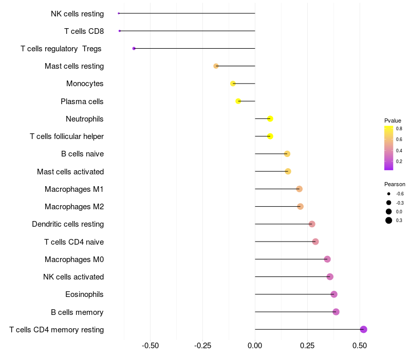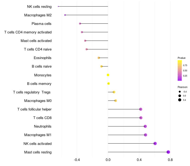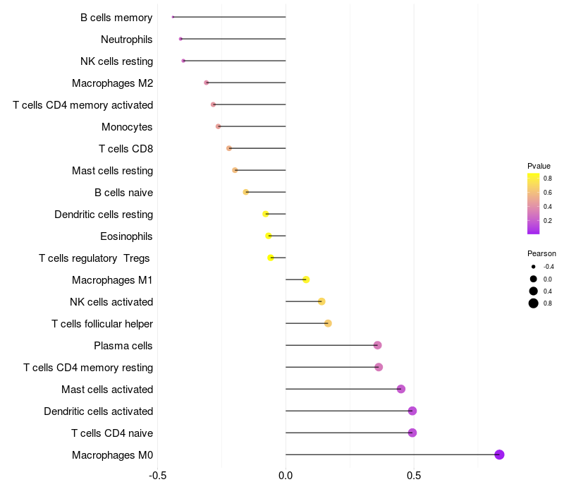 Lollipop of DUSP16 expression and immune infiltrating cell level correlation result in HBV+ Liver cirrhosis samples