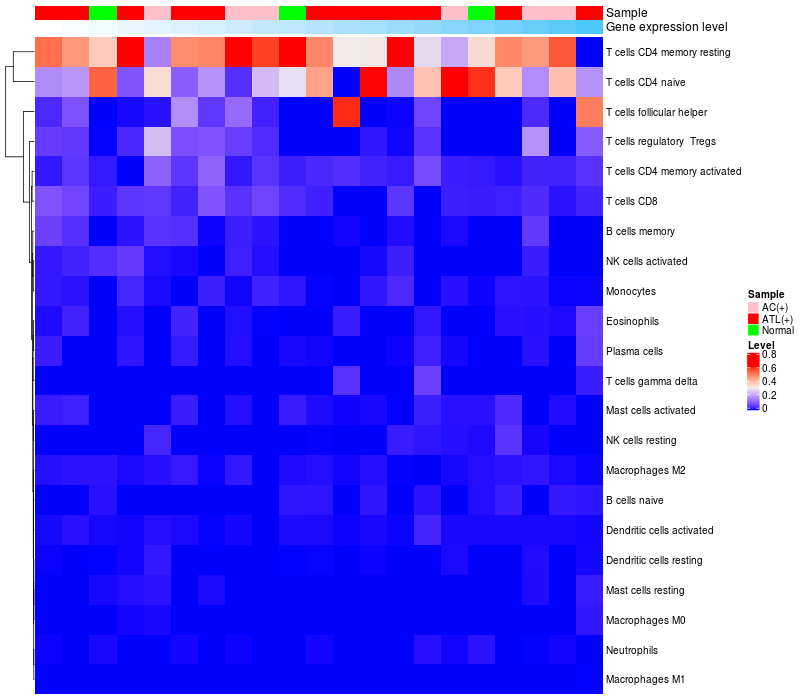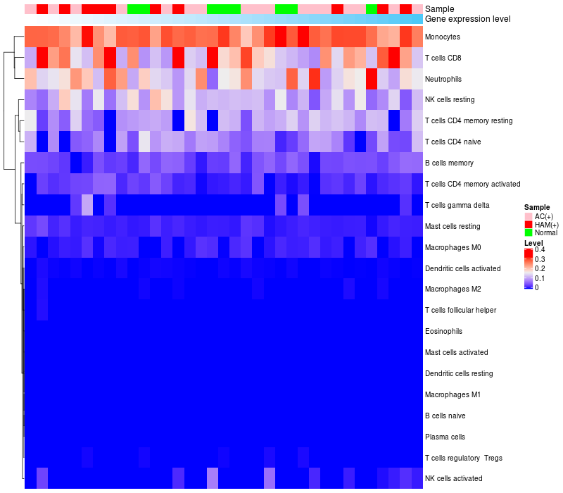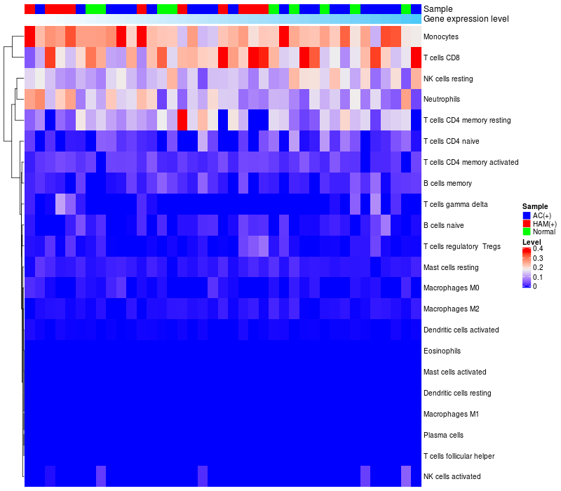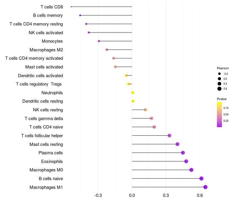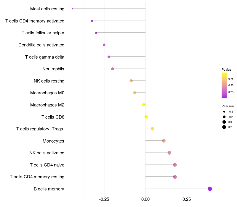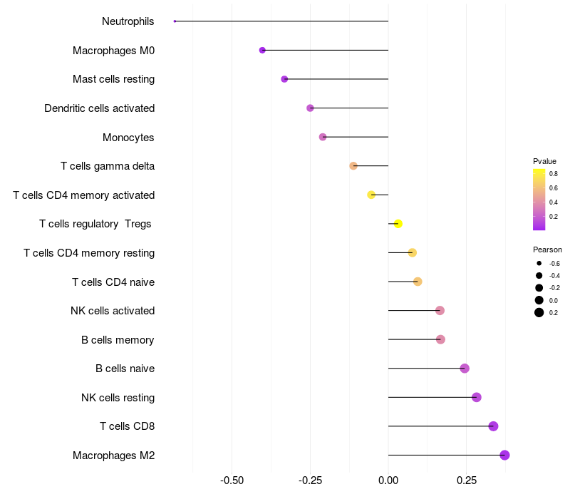 Lollipop of DYNC2LI1 expression and immune infiltrating cell level correlation result in HTLV1+ samples