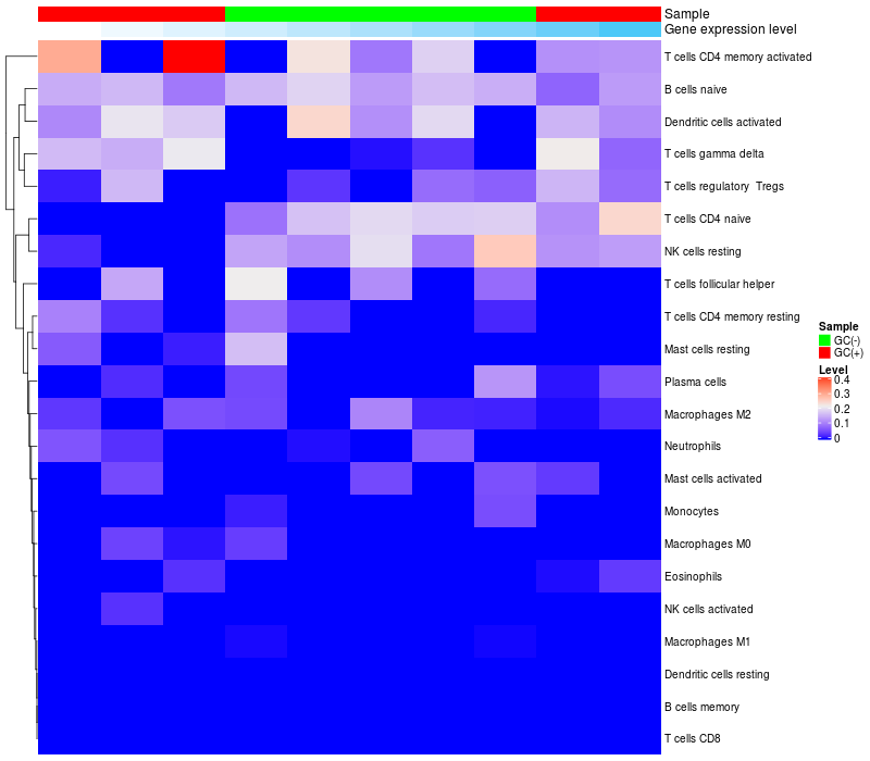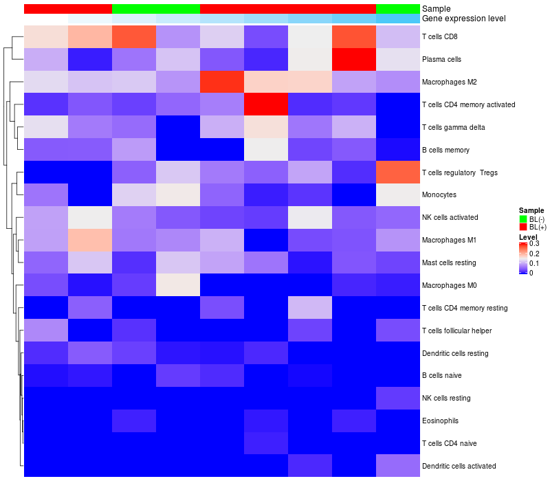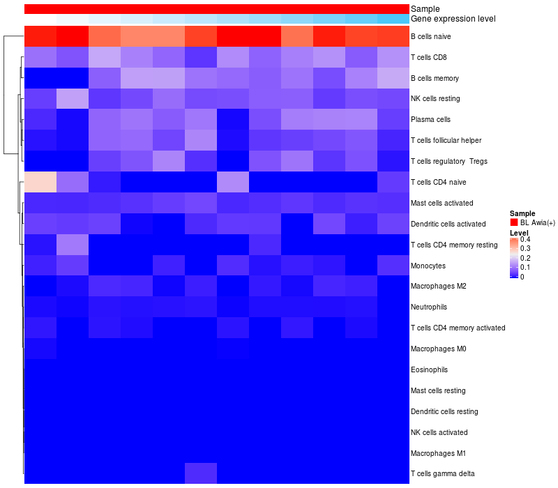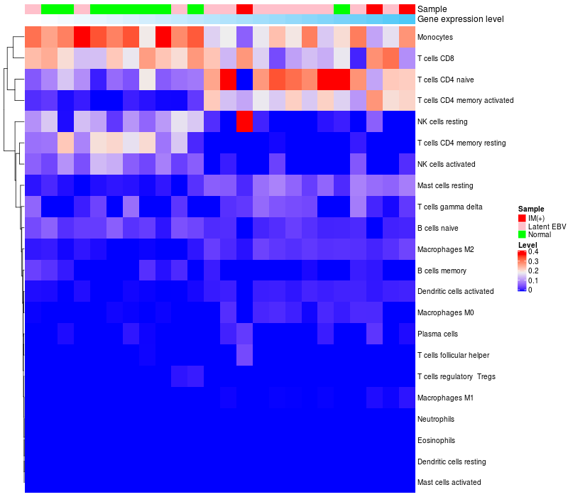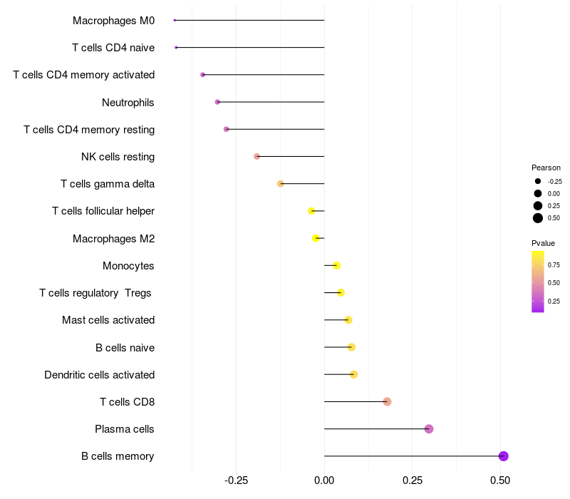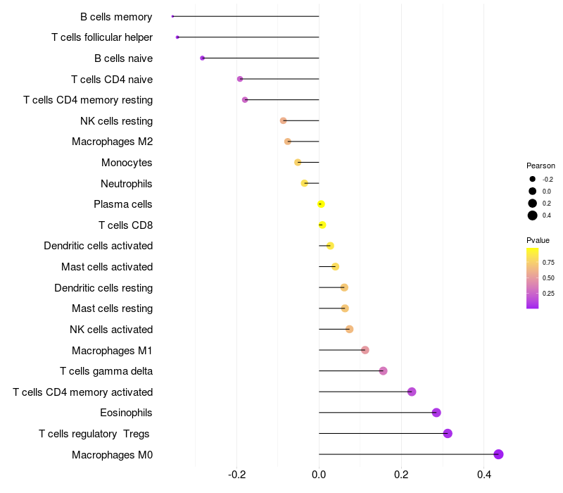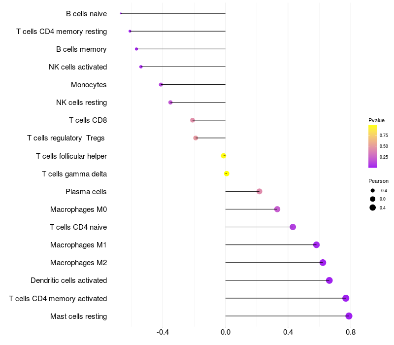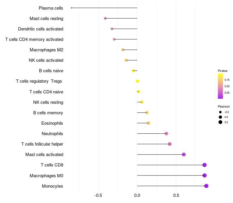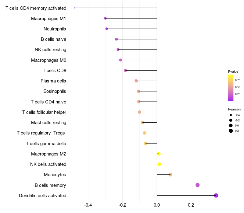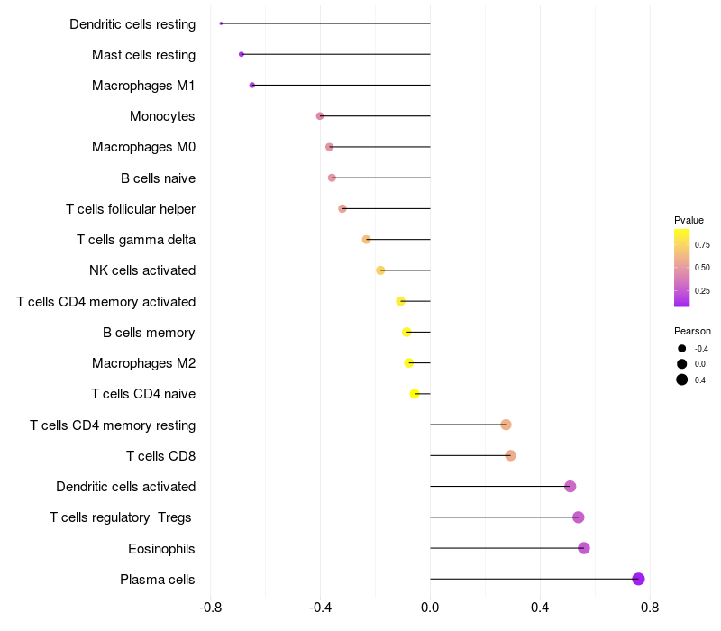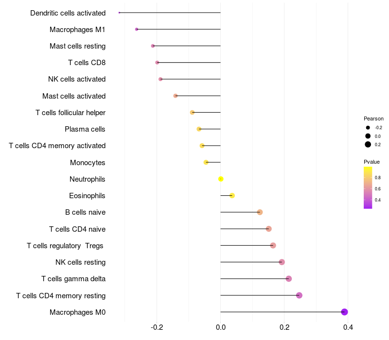 Lollipop of EBF3 expression and immune infiltrating cell level correlation result in EBV+ samples