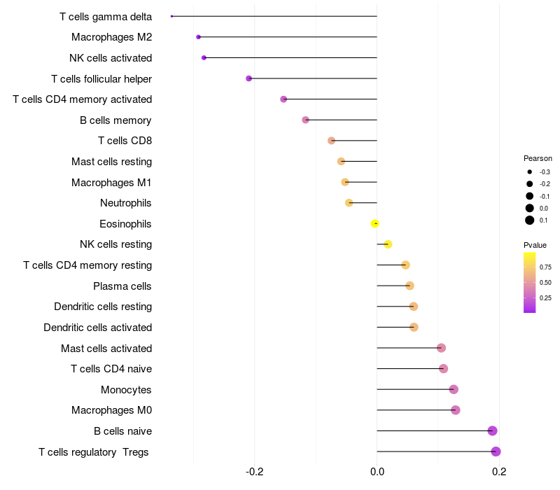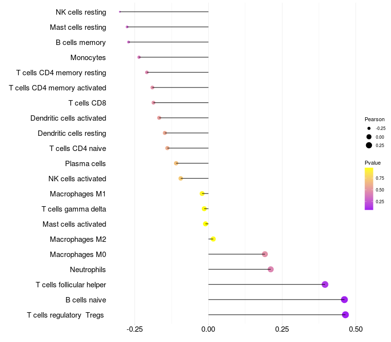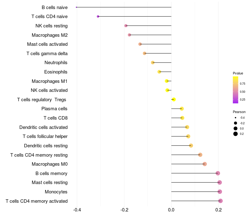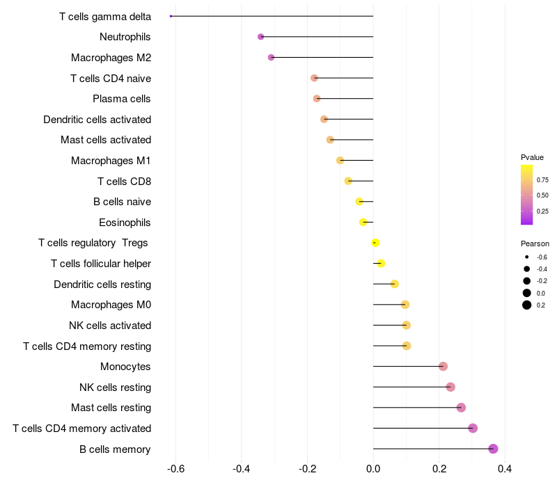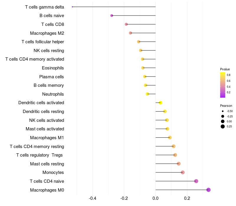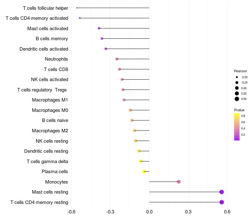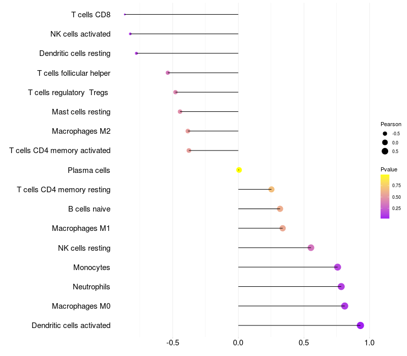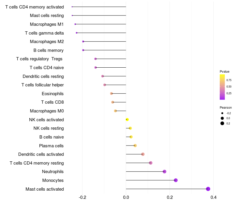 Lollipop of EDN1 expression and immune infiltrating cell level correlation result in HPV+ samples